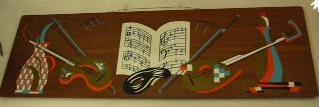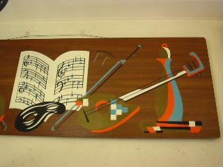 | ビンテージウォールデコ / 50年代 ウッドベースに楽器・音符・楽譜・ハーレクインマスクなどなど50'sモチーフ満載のビッグデコレーションアート。かなりクールな壁掛けです。 |