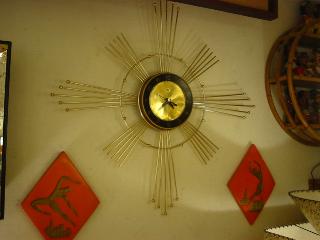 | スターバーストウォールクロック / 50年代 LUX社 MADE IN USA. ゴールドワイヤーのスターバーストデコレーションフレームにセンター部分はプラスチックボディのムーブメントケース。 ムーブメントはバッテリータイプに交換済みですから時間は正確です。 |