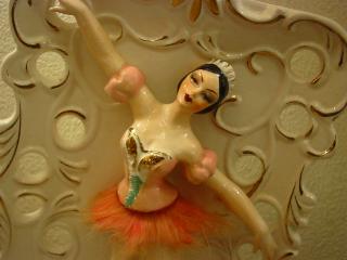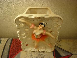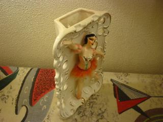 | バレリーナ置物・プランター / 50年代 Enesco, MADE IN JAPAN. 陶器製。壁掛けにもなる置物・プランターベースです。同じシリーズでデビルタイプもあるレアな1点。ウエストはデビルレディと同じファーデコレーション。 |