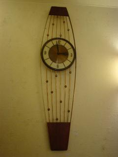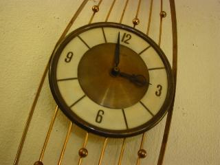 | アトミックウォールクロック / 50年代 Welby社 メタルフレームとワイヤーデコレーションに上下ウッドパネルの壁掛け時計。ワイヤーにはボールデコレーション。 ムーブメントはウェルビー社オリジナルバッテリータイプ(単1 x 1個使用)。 |