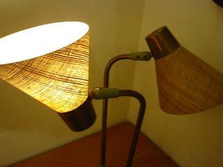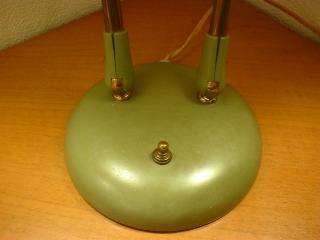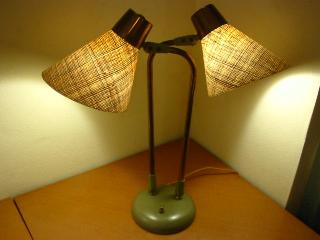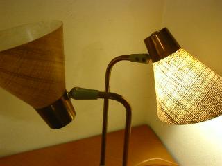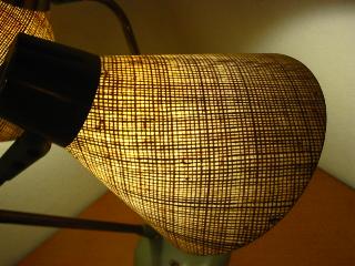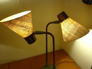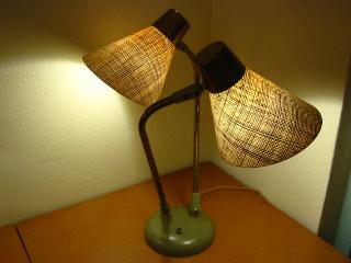 | アトミックダブルシェードランプ / 50年代 USA ツインアームのデスクランプタイプ。シェードはファイバーグラス製。アームとシェードの方向はかなり自在に調節可能ですからいろいろなスタイルで楽しめます! 電源は家庭用コンセント対応コードで、スイッチはランプベースに付いています(左・右・両方・OFF)。 |