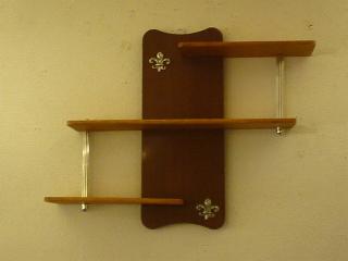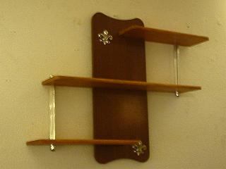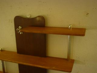 | アトミックウォールシェルフ / 50-60年代 ビンテージの3段壁掛けシェルフ。センターのアトミックシェイプマウントは木目のプラスチック製、それぞれの棚はウッドです。 小物などのディスプレイにGOOD! |