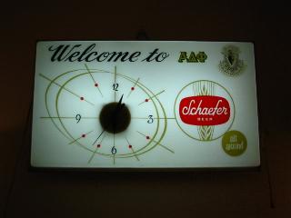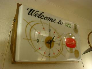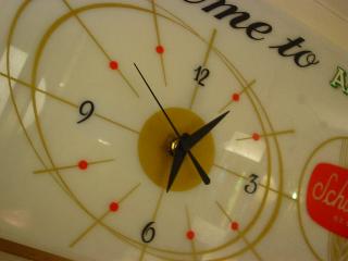 | ライトアップウォールサインクロック / 50年代. ビールメーカーのサインクロックランプです。時計のムーブメントは交換済みですので時間は正確です。電源は家庭用コンセント対応コードで、スイッチは本体右側に付いていてプルタイプ( PULL ON / OFF )。 |