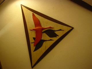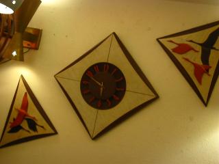 | ミッドセンチュリーウォールクロック&ウォールデコセット / 50-60年代 ウッド壁掛け時計とペア壁飾りの3pcセット。 ウォールデコは鳥のオレンジ部分がネジ止め、こげ茶部分は掘り込んである3Dタイプです。時計のムーブメントはバッテリータイプ(単1x1個)です。 |