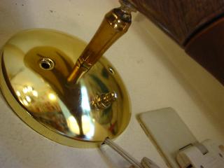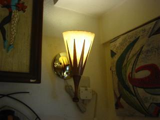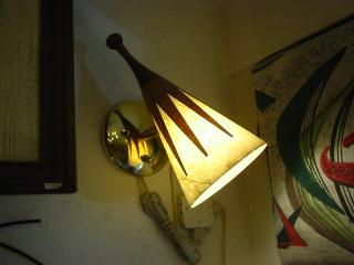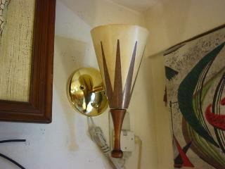 | アトミックモダンウォールランプ 50年代 ファイバーグラスシェードにウッドテールデコレーションの壁掛け用ランプです。シェード方向もある程度自在にセットできます。 電源は家庭用コンセント対応です。スイッチはベースに付いていてロータリータイプです。 |