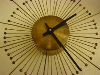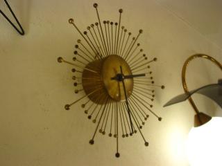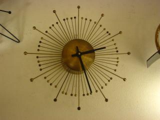 | アトミックスターバーストウォールクロック / 50年代 スターバースト壁掛け時計。スプートニクスポークタイプのウォールクロックです。ダイヤル数字なしでブラックハンドがとてもシンプルでクール! ムーブメントはオリジナルバッテリータイプ(単1x1個使用)です。 |
