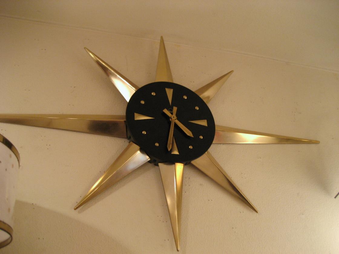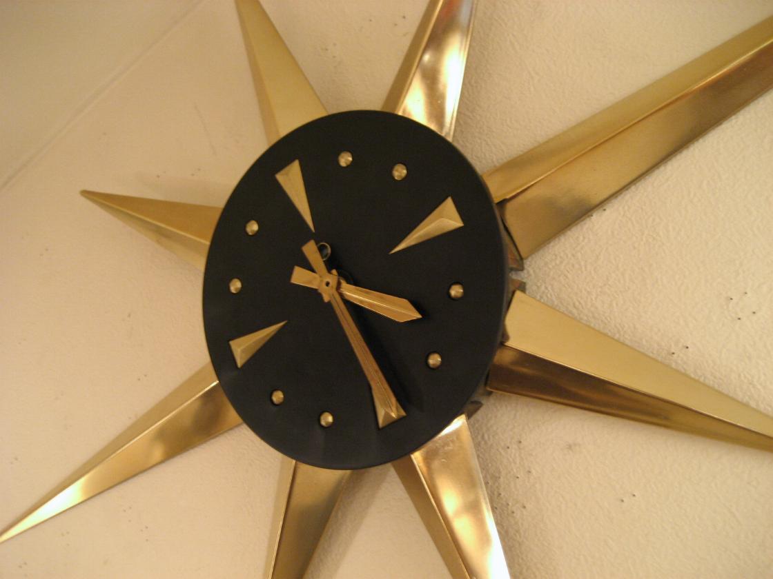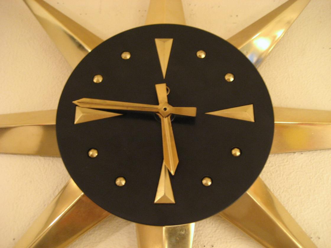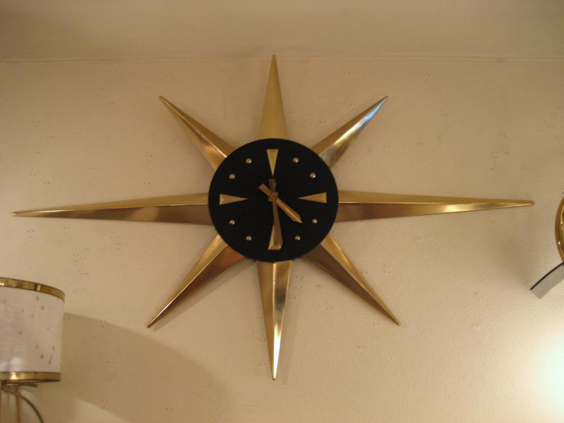 | アトミックスターバーストウォールクロック / 50-60年代 スターバースト壁掛け時計。プラスチック製でスポークは取り外し可能ですので写真は横長ですが縦長タイプにも変更自在です。ブラックの文字盤にゴールドのダイヤルと針がクール! ムーブメントはバッテリータイプ(単3x1個使用)に交換済みですので時間も正確です。 |