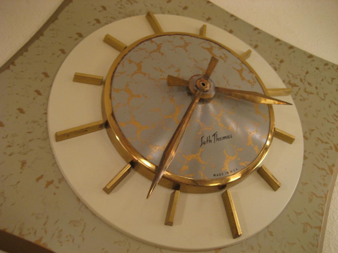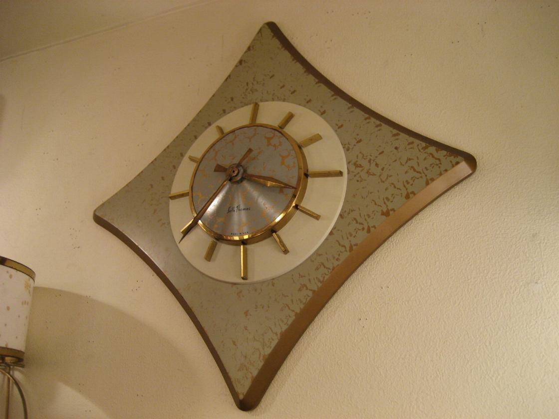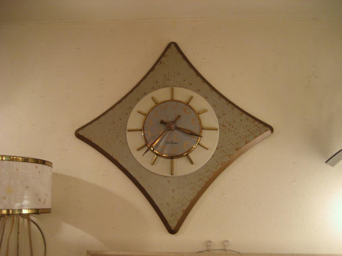 | アトミックウォールクロック / 50-60年代 Seth Thomas, MADE IN USA. ダイヤシェイプのアトミック壁掛け時計。木製ベースにベージュとゴールドでアクセントペイントされています。 ムーブメントはバッテリータイプ(単3x1個使用)に交換済みですので時間も正確です。 |
