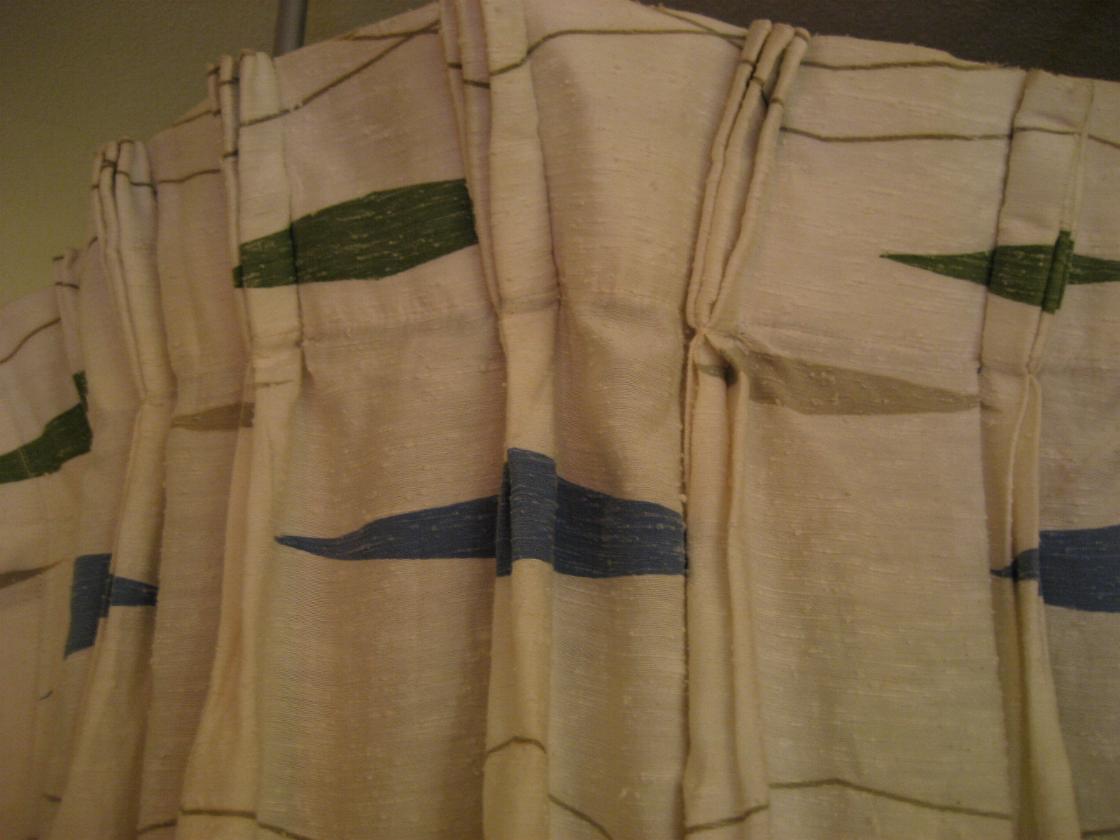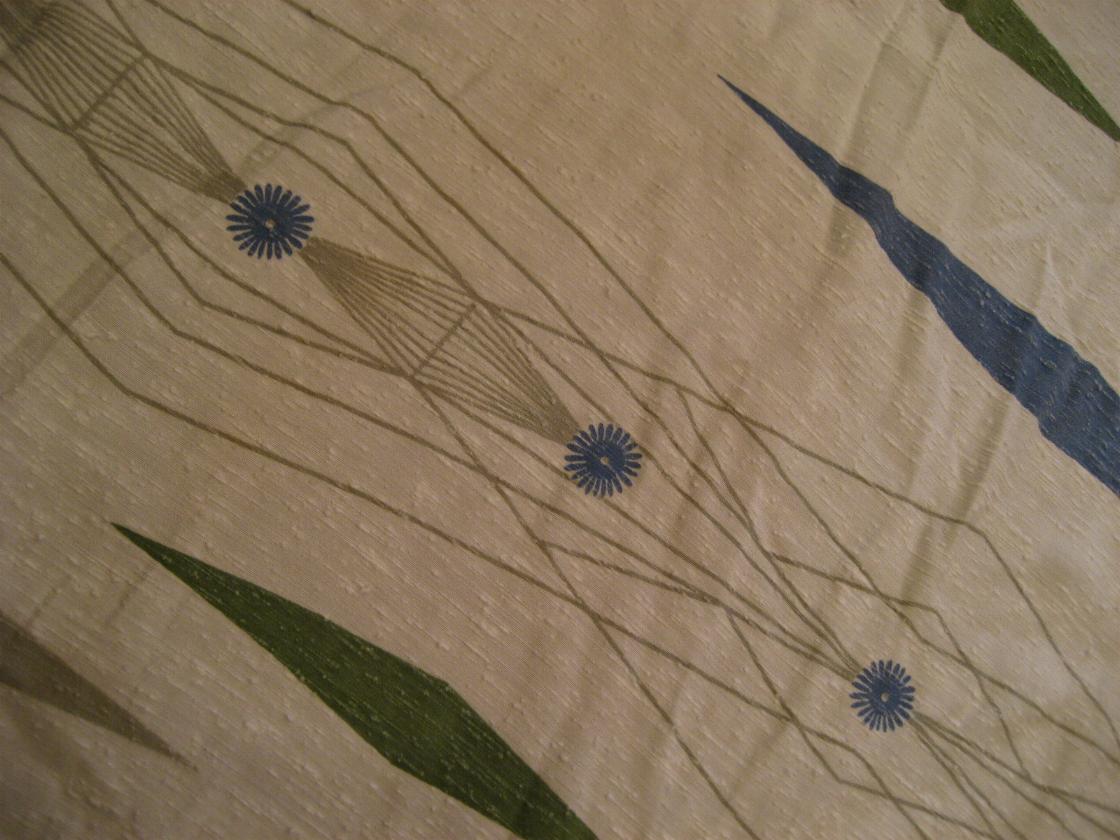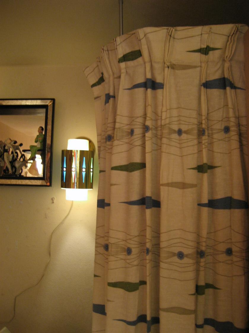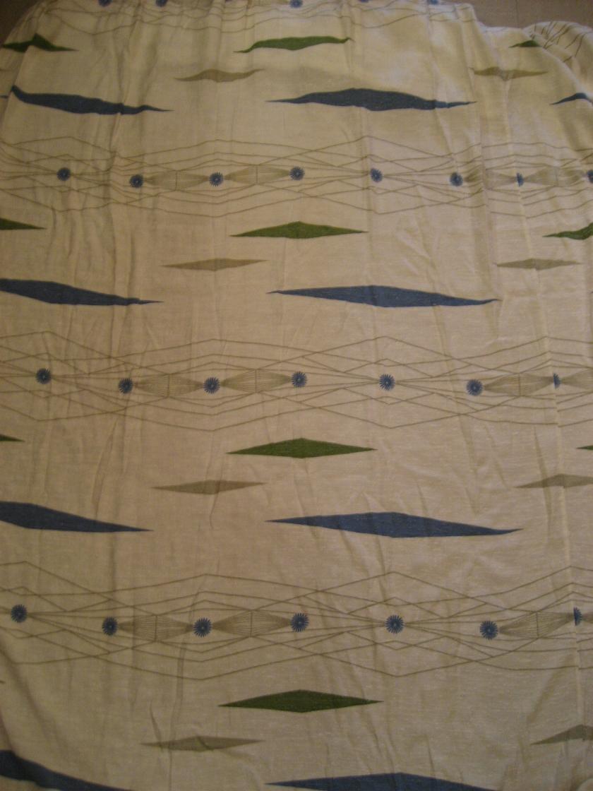 | アトミックプリントカーテン / 50-60年代. ビンテージのカーテンです。色はオフホワイトグラウンドベースカラーにブルー・グレー・グリーンなどのアトミックプリント。トップ部分はカーテンプリーツが取ってあり、市販のカーテンフックを付けてご使用下さい。素材はコットンレーヨンのブレンドタイプ。 |