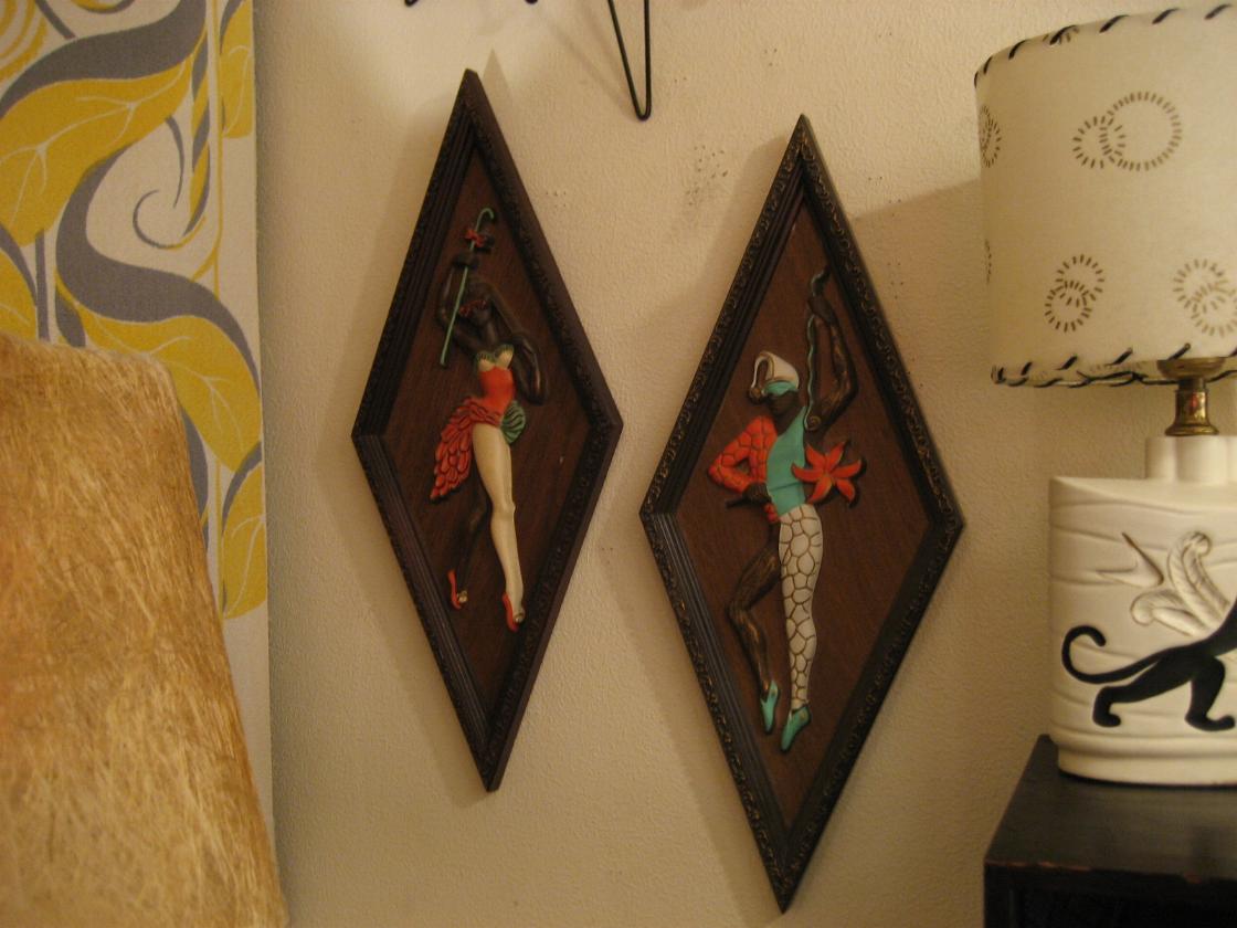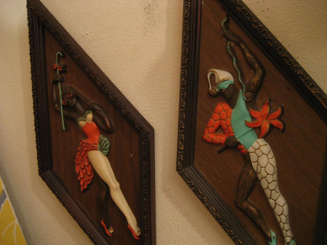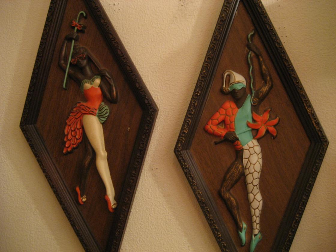 | ペアハーレクイン壁掛け 50-60年代 プラスチック製の定番ダイヤ型ハーレクインウォールデコ。立体エンボスのダンサータイプのビンテージ壁掛けです。 |