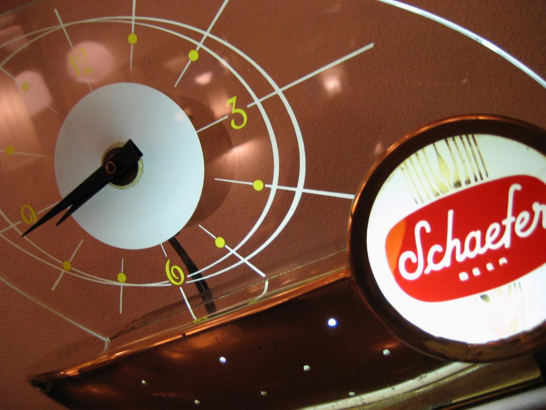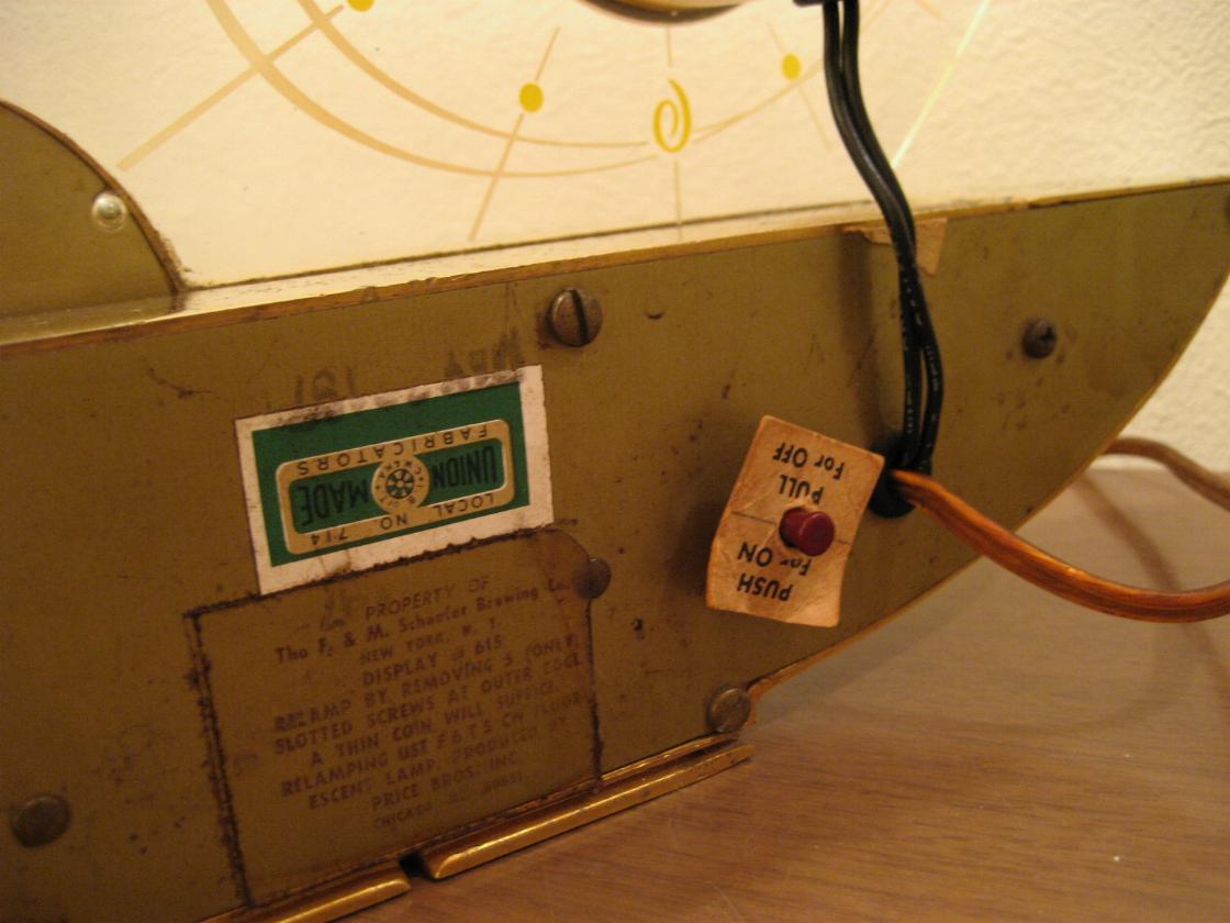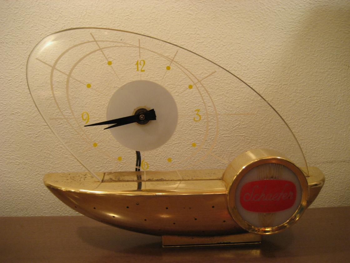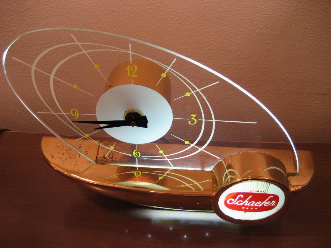 | アトミックライトアップサインクロック / 50年代 ビールメーカーのサインクロックです。ブーメランシェイプの透明アクリル製のアトミックな文字盤がクール!時計は電気式で周波数の関係上時間はズレます。電源は家庭用コンセント対応でライトアップスイッチは裏面にあります(PUSH:ON / PULL:OFF)。 |