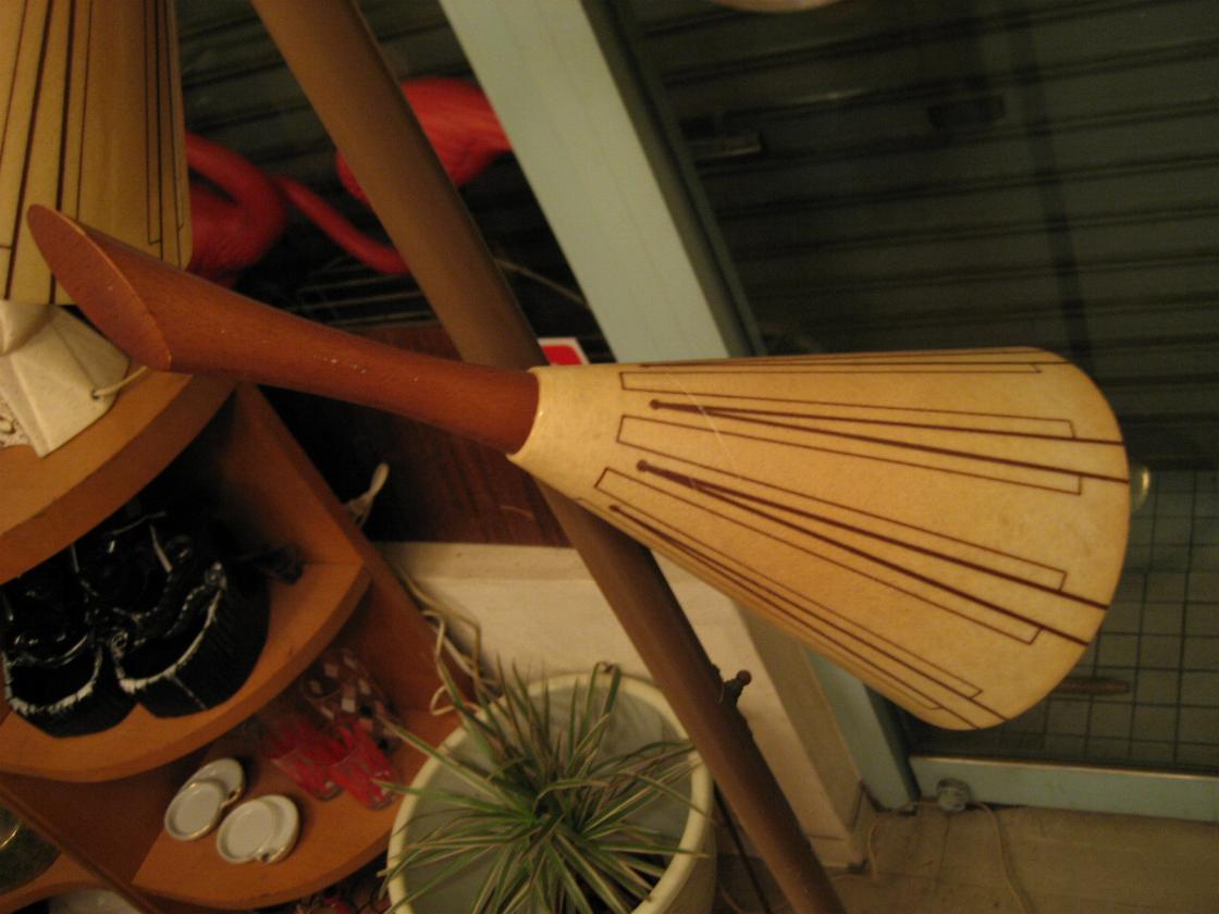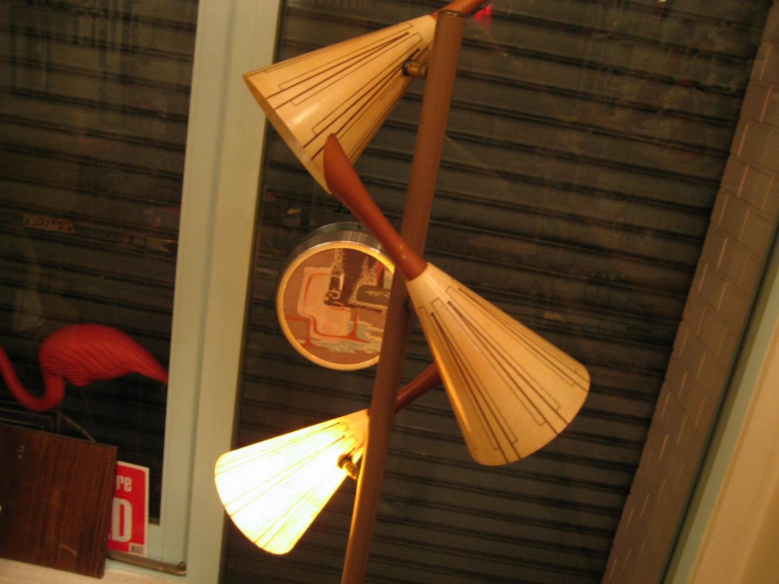 | ミッドセンチュリーフロアランプスタンド / 50-60年代. 3スポットのビンテージフロアランプです。各シェードはアトミックストライプのファイバーグラスでそれぞれシェード後部にウッドデコレーション。 電源は家庭用コンセント対応コードで、スイッチはポールに付いていて3WAYタイプ(1・2・3・OFF)です。床置きタイプなので設置や移動も簡単に可能です。 |