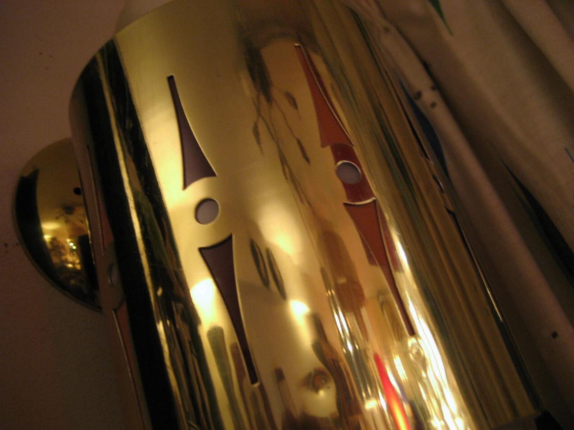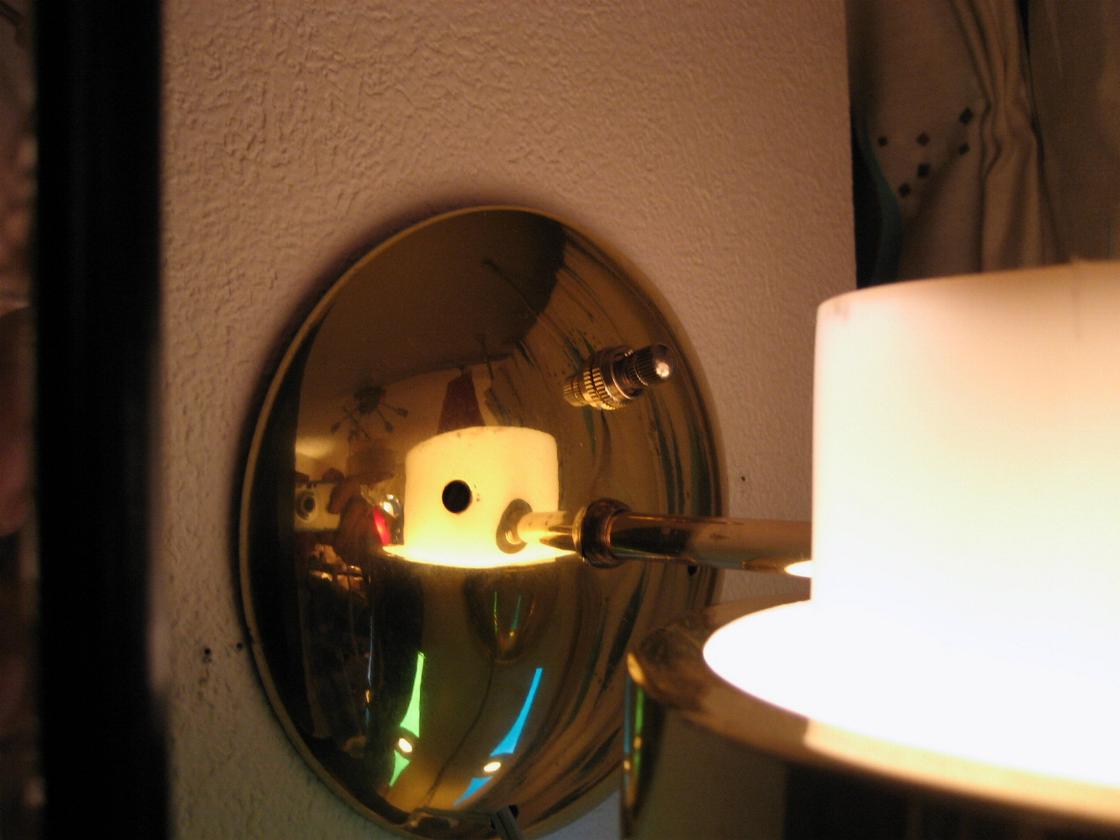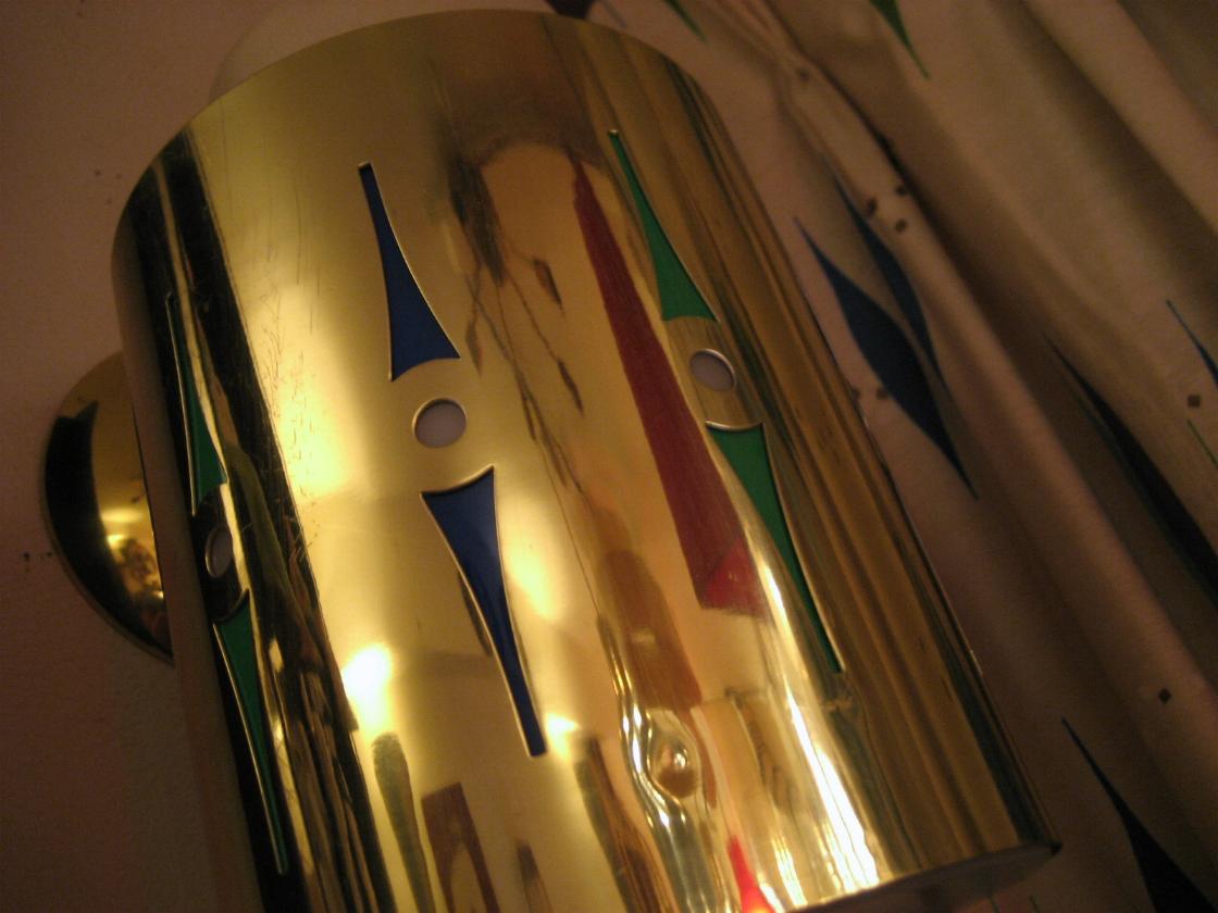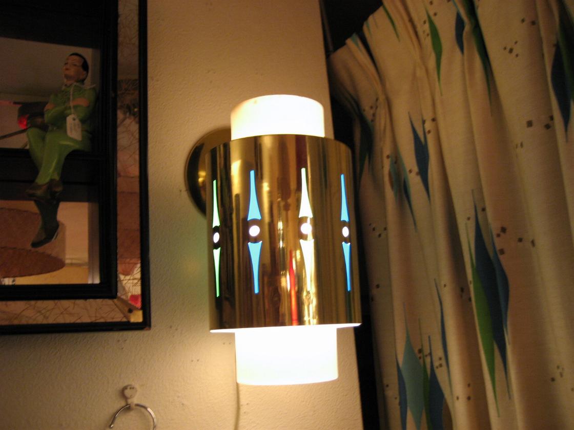 | アトミックウォールランプ / 60年代 ( 1963. LIGHTCRAFT OF CALIF, USA. ) プラスチック製のインナーシェードに外側メタルカバーで、間に2種類計4色のカラーフィルムが付いています。外側メタルカバーをまわすことによって2通りのカラーバリエーションを楽しむことができてお部屋の雰囲気や気分に合わせて使い分けできます( ブルー & グリーン と ブラウン & オレンジ・・・写真参照 )。 電源は家庭用コンセント対応コードで、スイッチはウォールマウントベースに付いていてロータリータイプ。 |