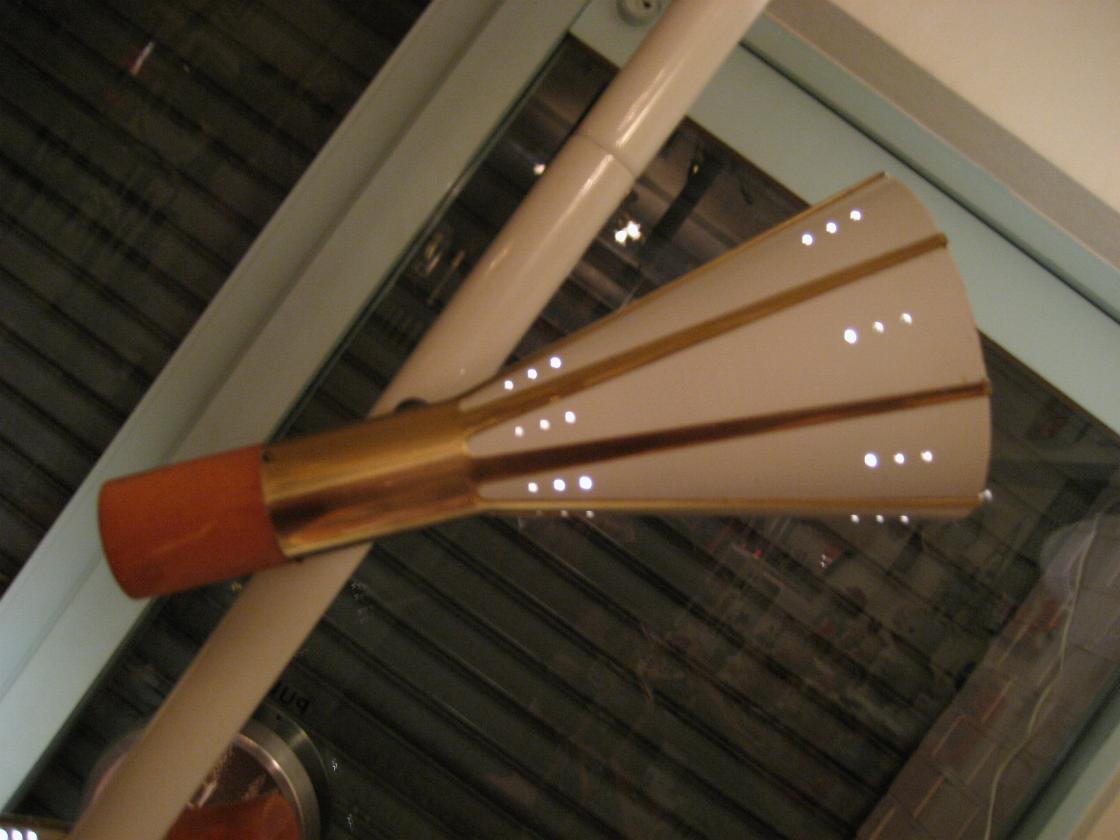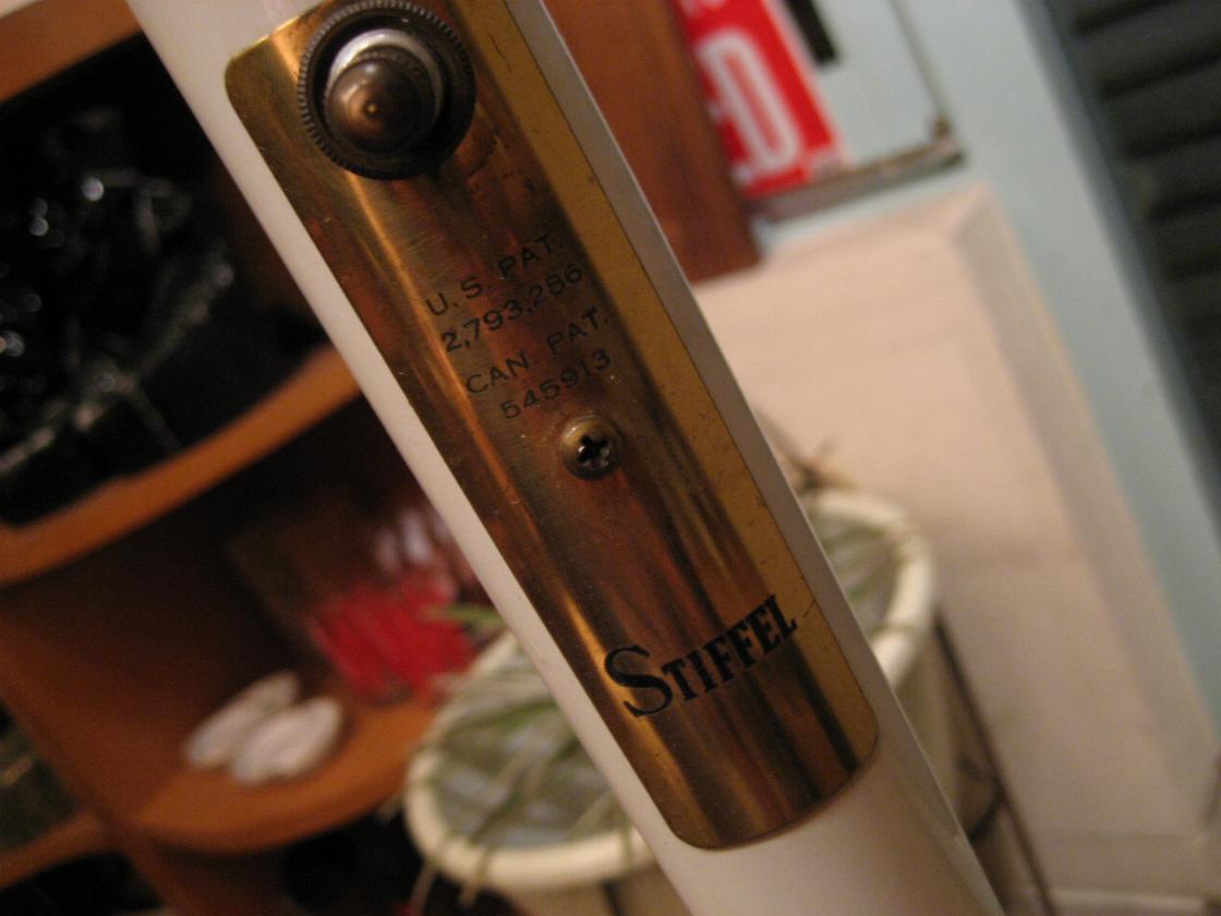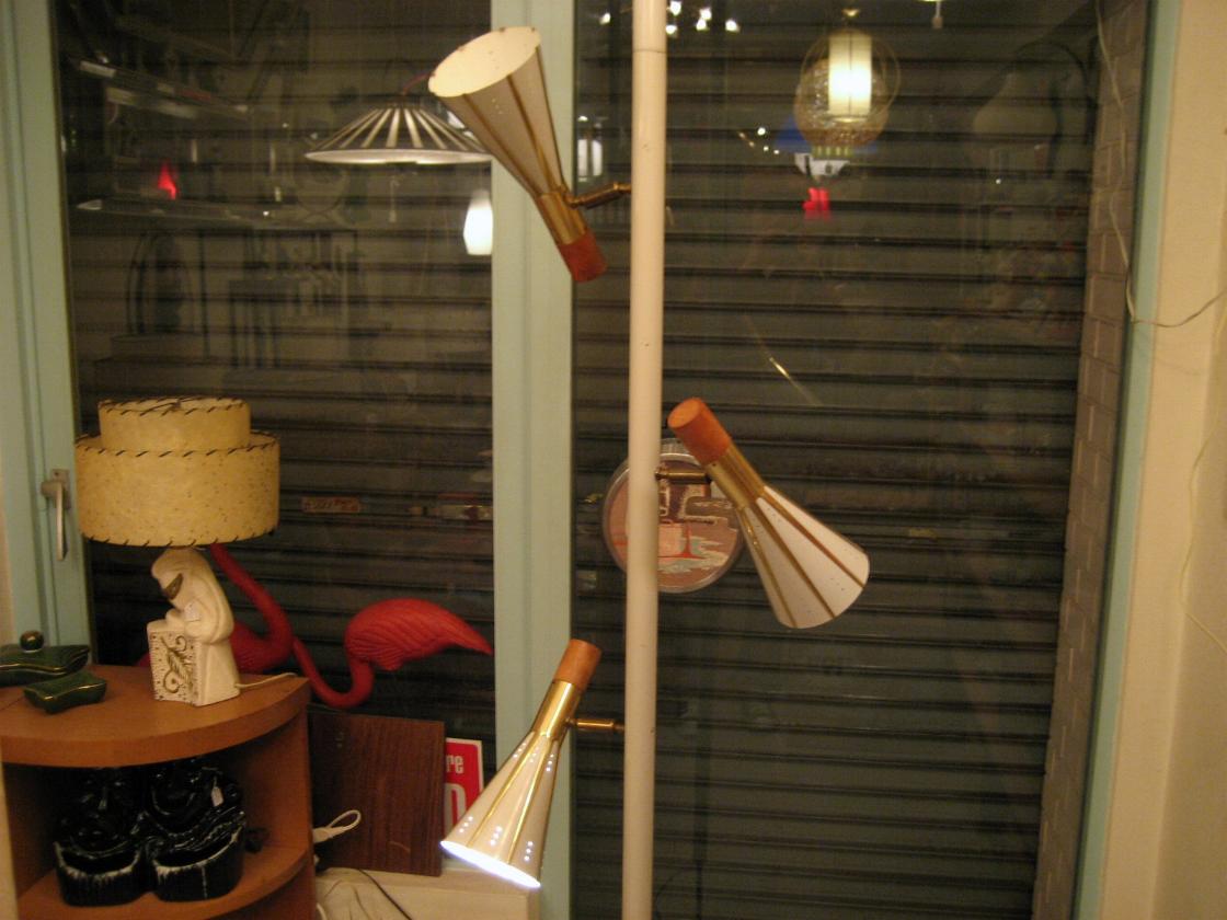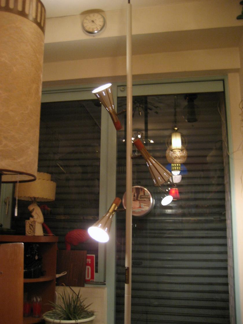 | ミッドセンチュリーフロアポールランプ / 50-60年代 STIFFEL社製 その昔シアーズで販売されていたメーカーのひとつでアメリカでも人気の高いメーカーです。このタイプはスタイリッシュな細めのシェードと2ヶ所で調節が可能なアーム(他のほとんどのスポットタイプが1ヶ所のみで方向調節)が特徴です。各シェードはゴールドアクセントに後方はウッドデコレーション。天井と床に突っ張らせるテンションロッドタイプ。 電源は家庭用コンセント対応コードで、スイッチはポールに付いていて3WAYタイプ ( 3・2・1・OFF ) です。 アトミックでモダンなフロアランプです! |