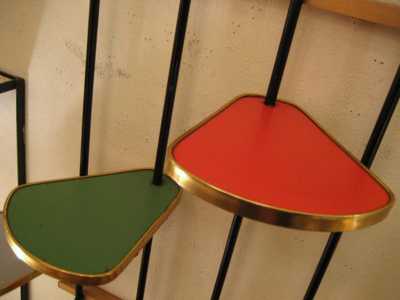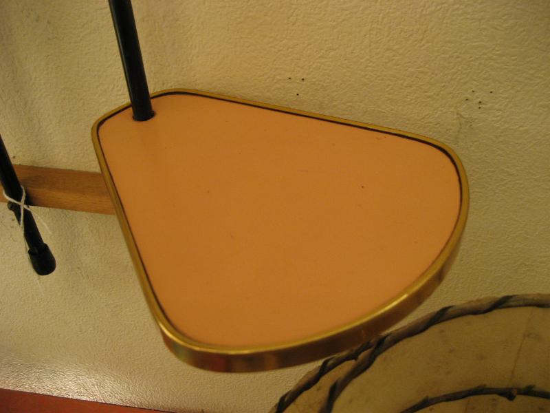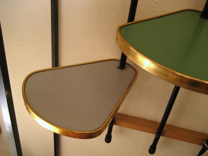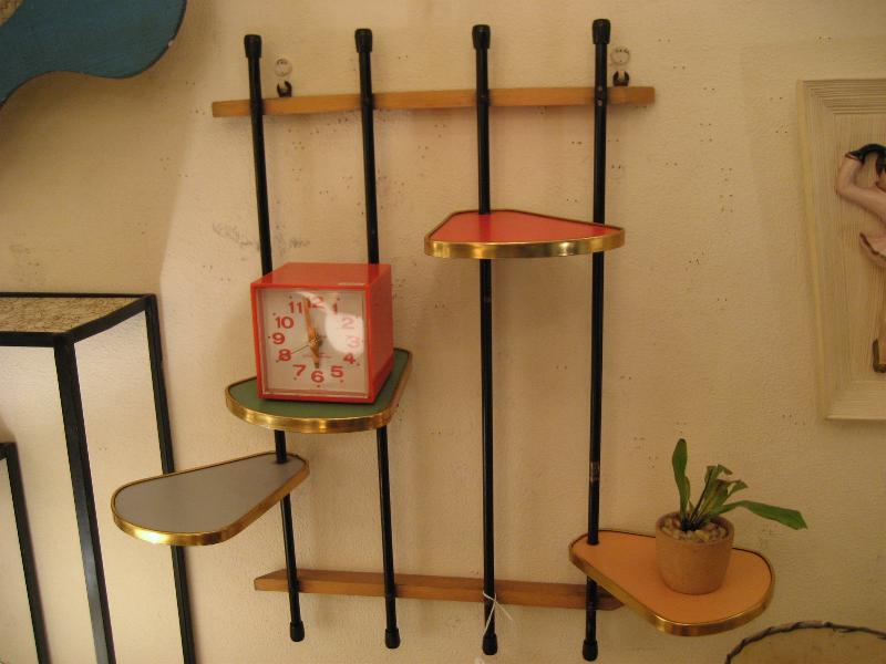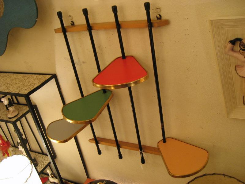 | アトミックウォールシェルフ / 50年代 ビンテージ壁掛けシェルフです。上下のウッドフレームとタテに4本のブラックペイントメタルパイプのフレームに段違いで4枚のシェルフが組んであります。それぞれのシェルフ(天板)は色違いの化粧合板トップでシェルフまわりはゴールドメタルモールデコ。 ディスプレイ用として、またはプラントシェルフなどなど使い方も多彩! |