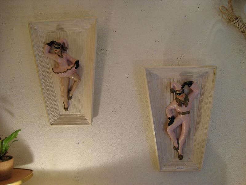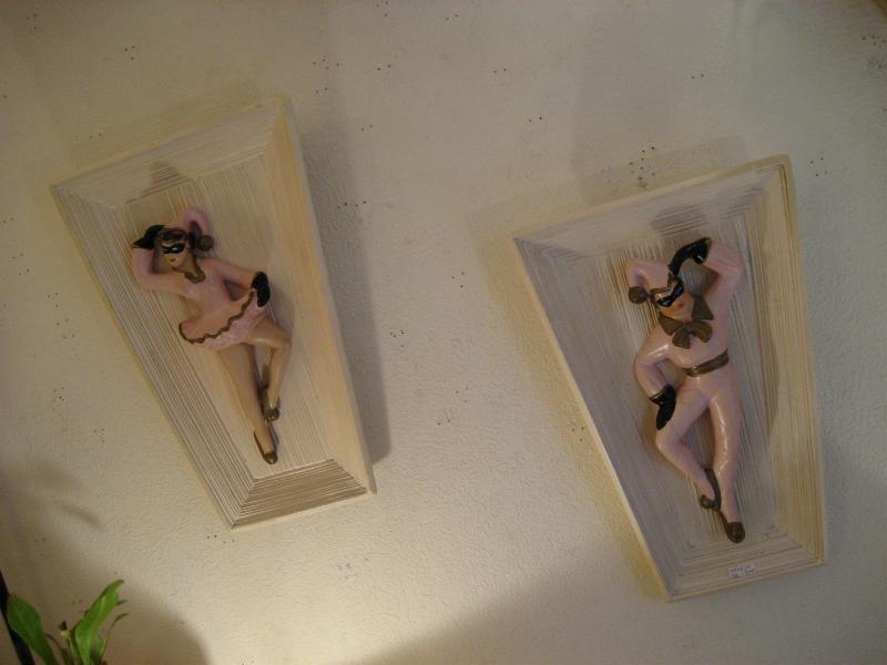 | ペアハーレクイン壁掛け 50年代 チョーク製のハーレクインウォールデコ。アイボリーの台形ベースにピンクのダンサー。黒金のカラーアクセントがGOODなビンテージ壁掛けです。 |