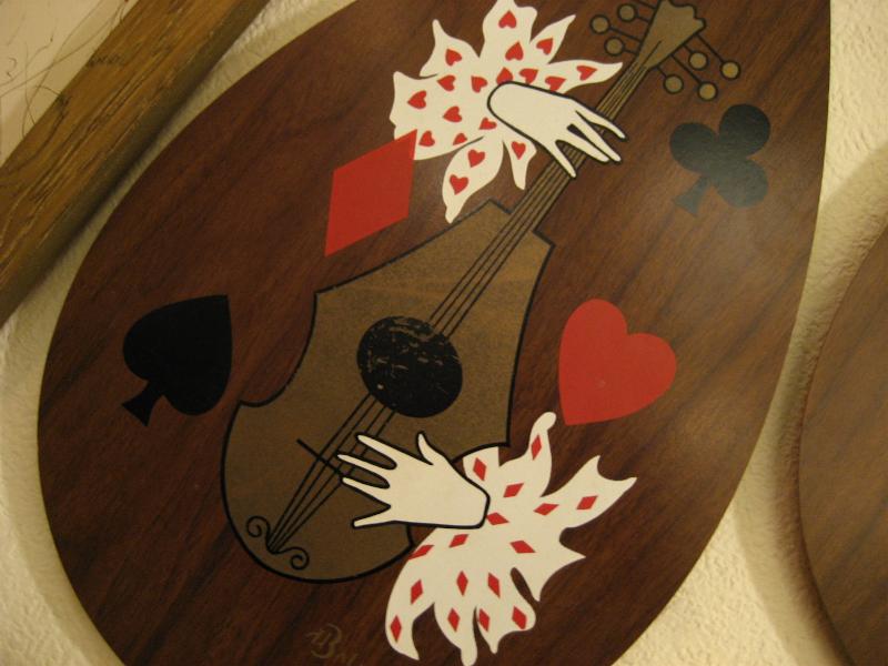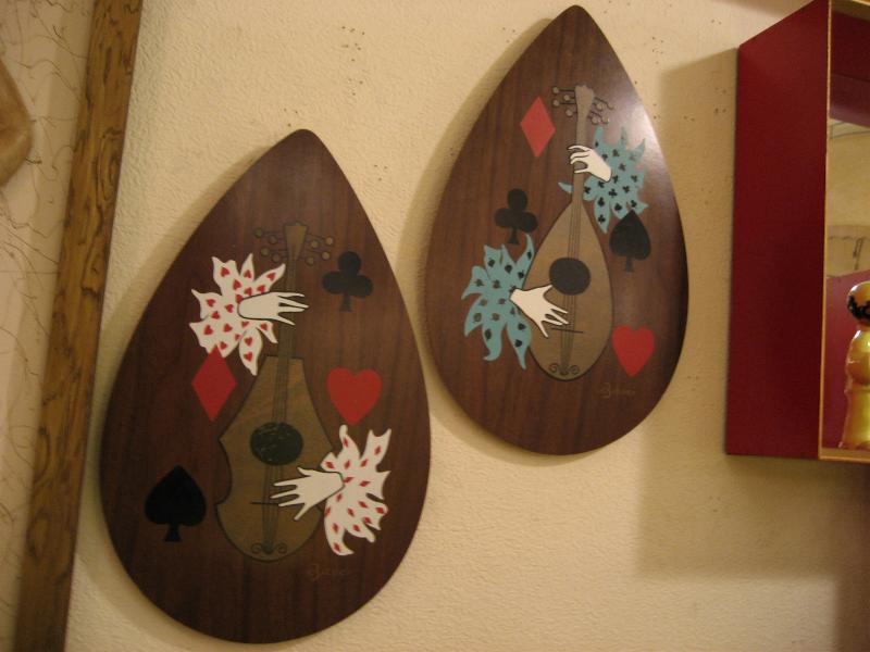 | ペアハーレクイン壁掛け 50-60年代 ウッド製のティアドロップ型ハーレクインウォールデコ。楽器を演奏している絵柄でトランプマークがデコレーションされています。 |