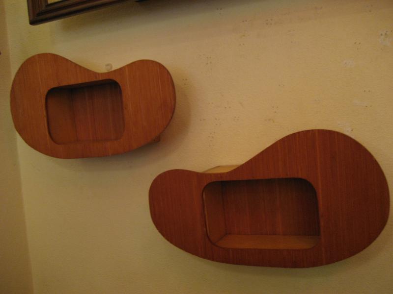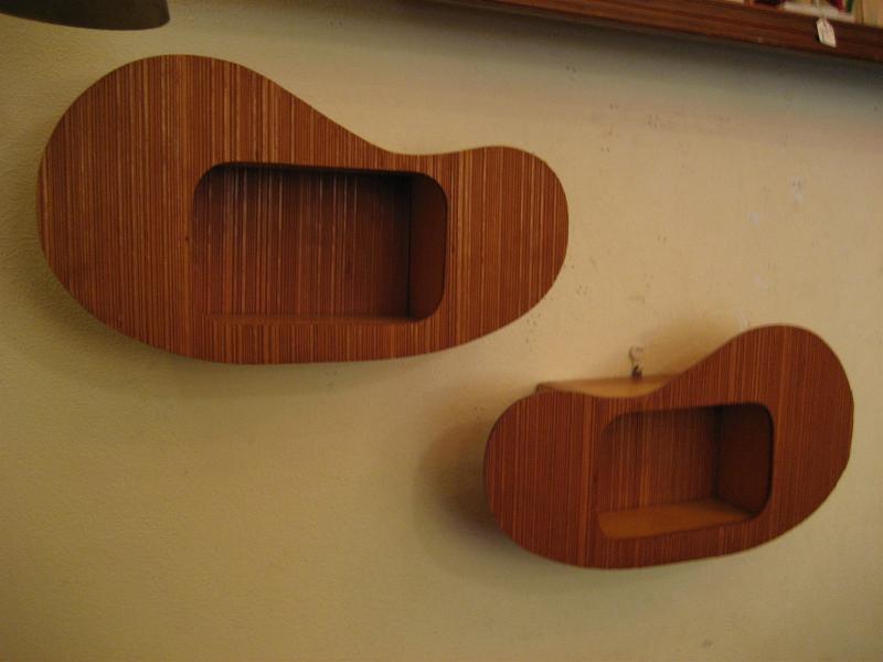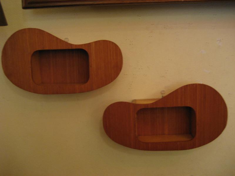 | ペアブーメランシャドウボックスシェルフ / 50年代 Kidneyシェイプのペアウォールシェルフ。落ち着いたカラーリングが小物や置物などのディスプレイにGOOD !!! ミッドセンチュリーなお部屋からオリエンタル、ハワイアンな雰囲気までOK! |