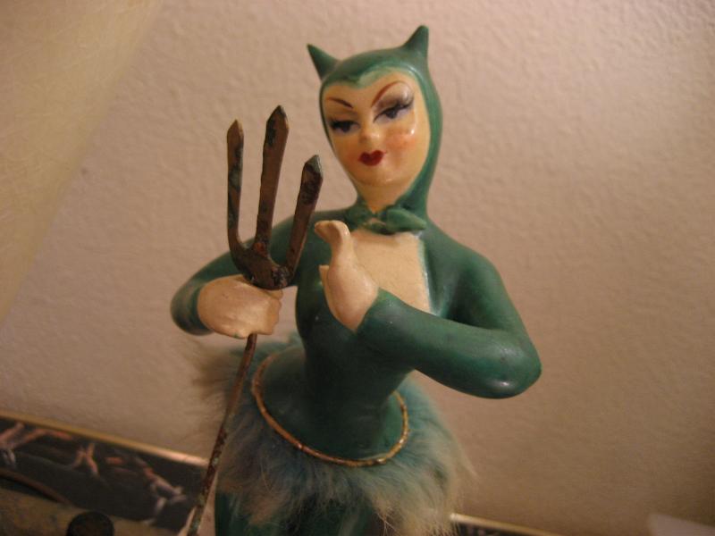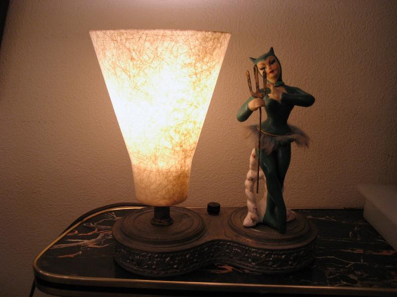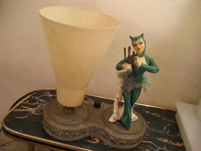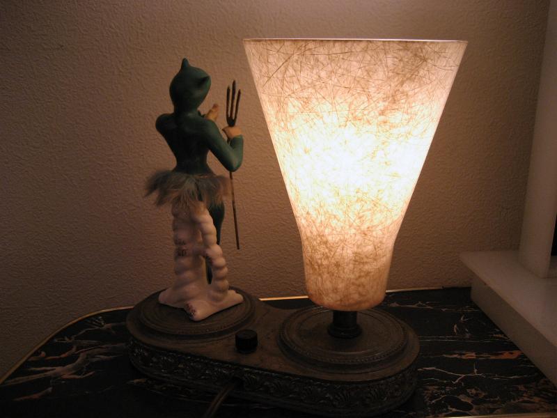 | ビンテージデビルTVランプ / 50年代. 陶器製グリーンカラーデビルレディのTVランプです。シェードはファイバーグラス製、ベースはシルバーメタル。デビルは裏面でネジ止めされています。 電源は家庭用コンセント対応コードで、スイッチはベース部分に付いていてロータリータイプ。 |