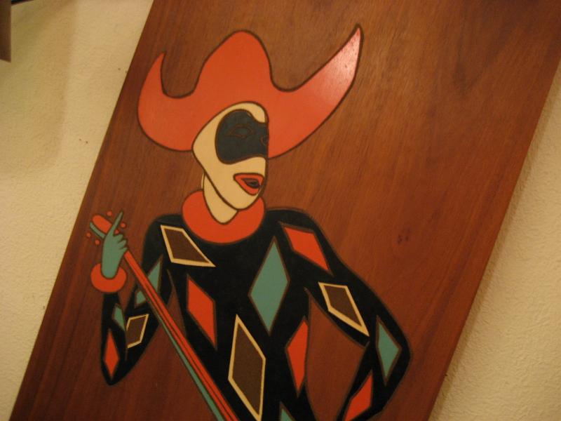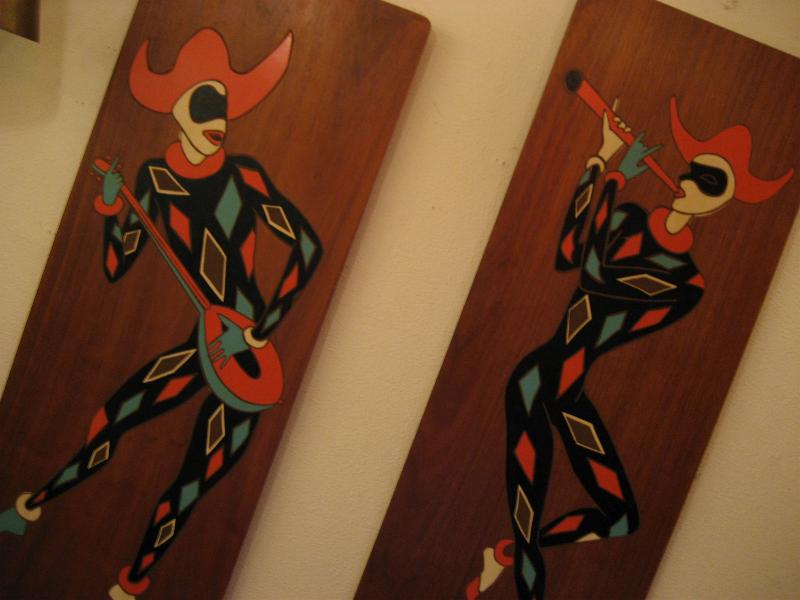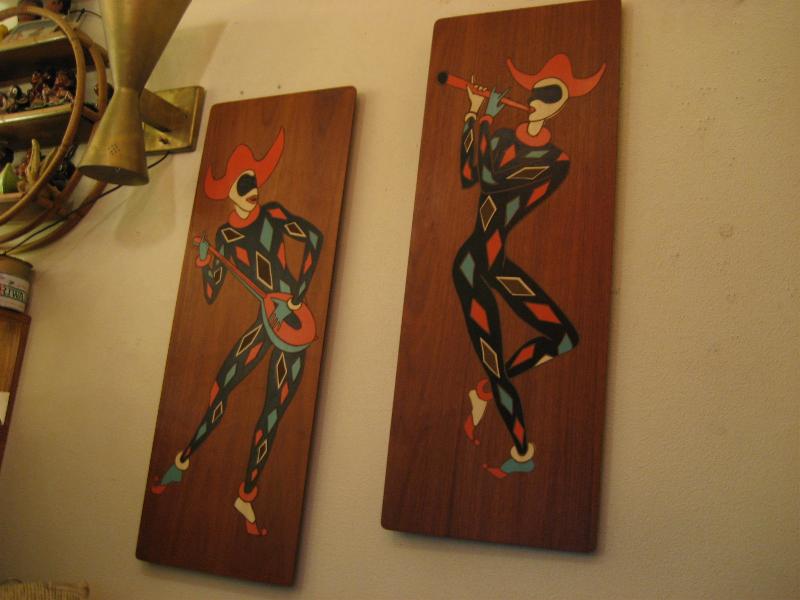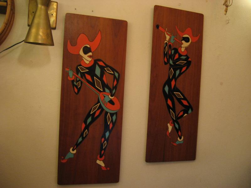 | ペアハーレクイン壁掛け 50年代 USA. ウッドベースにプリントされたハーレクインのBIGウォールデコ。楽器を持ったミュージシャンタイプ。 大きく、迫力ありでかなりクールです! |