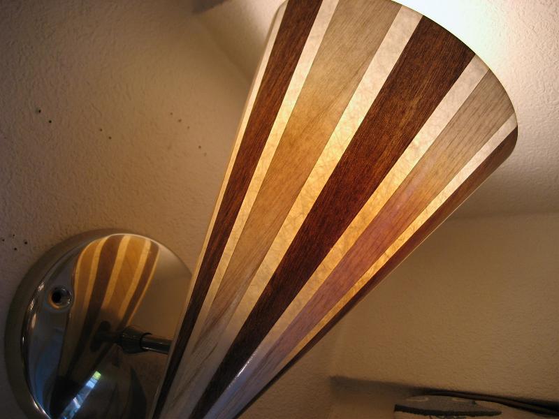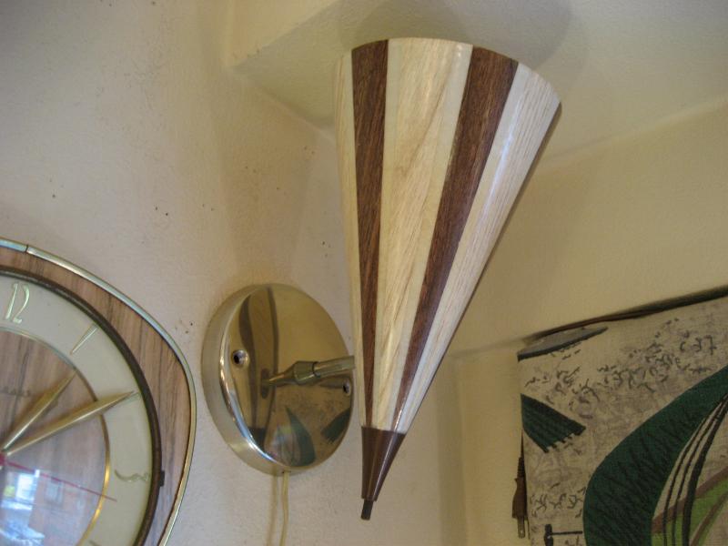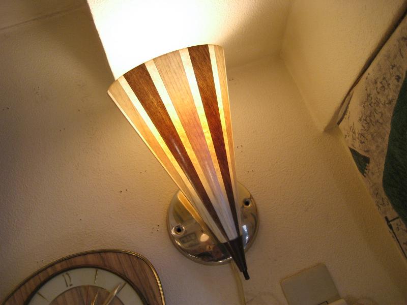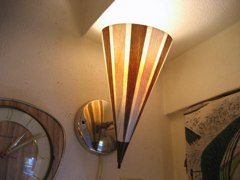| アトミックモダンウォールランプ 50年代 ウッド調ストライプのファイバーグラスシェード壁掛け用ランプです。シェード方向もある程度自在にセットできます。 電源は家庭用コンセント対応です。スイッチはシェード後部付いていてロータリータイプです。 |