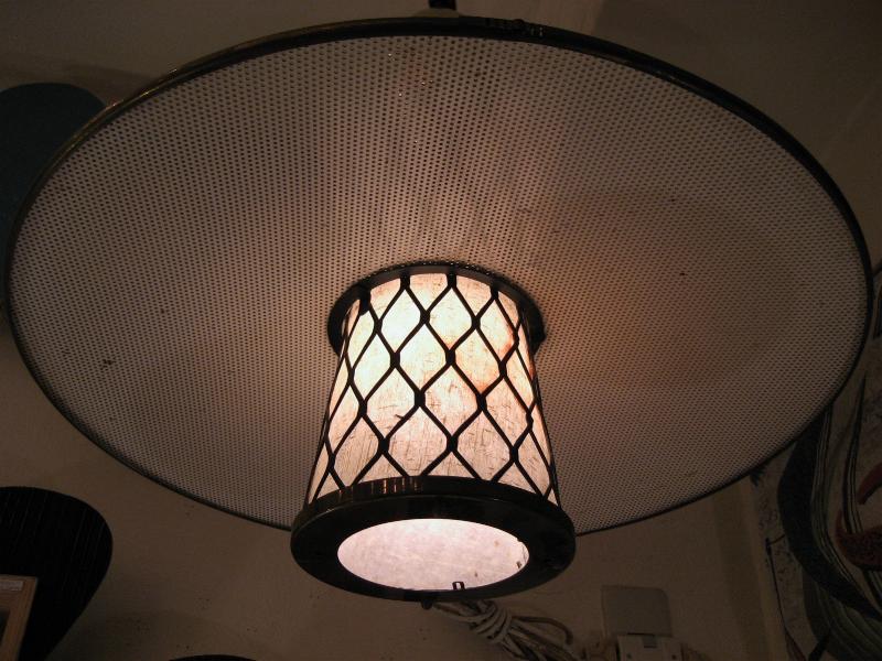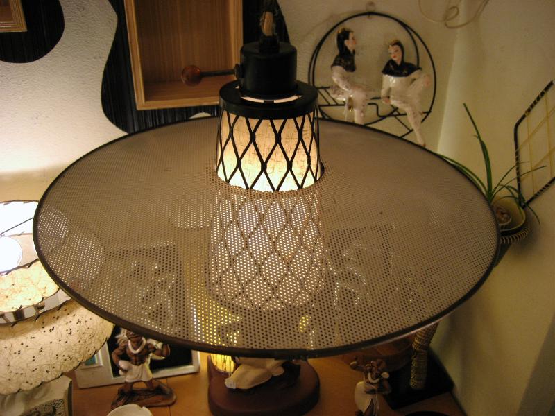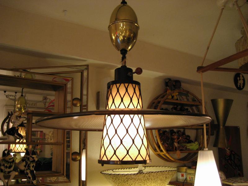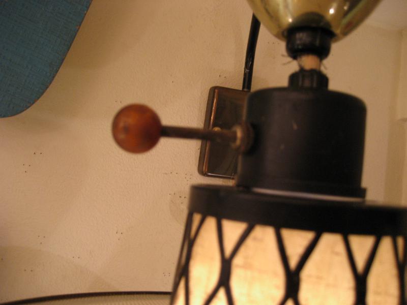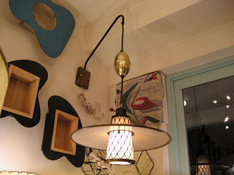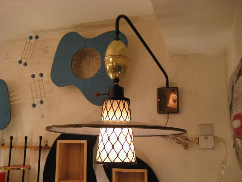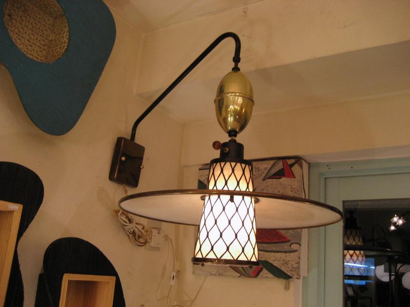 | アトミックウォールランプ 50年代 スウィングアームタイプのウォールランプです。アウターシェードはUFOシェイプメッシュタイプでセンターシェードはブラックワイヤーフレームにファイバーグラスのインナーシェード。上下にアップダウン可能でアームも左右に動きます。ウォールマウントはゴールドメタル。 電源は家庭用コンセント対応です。スイッチはシェード側面上部に付いていていてロータリータイプです。 |