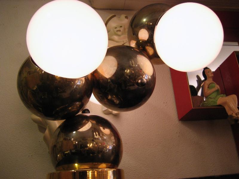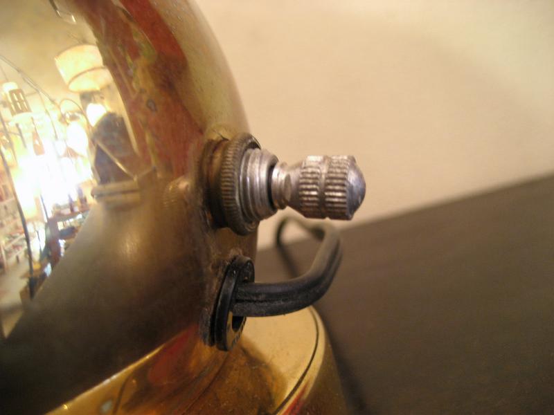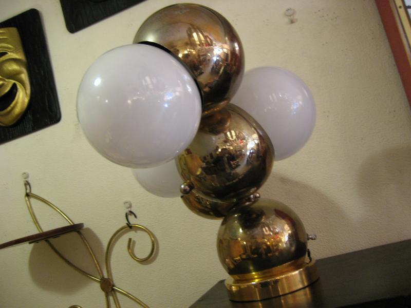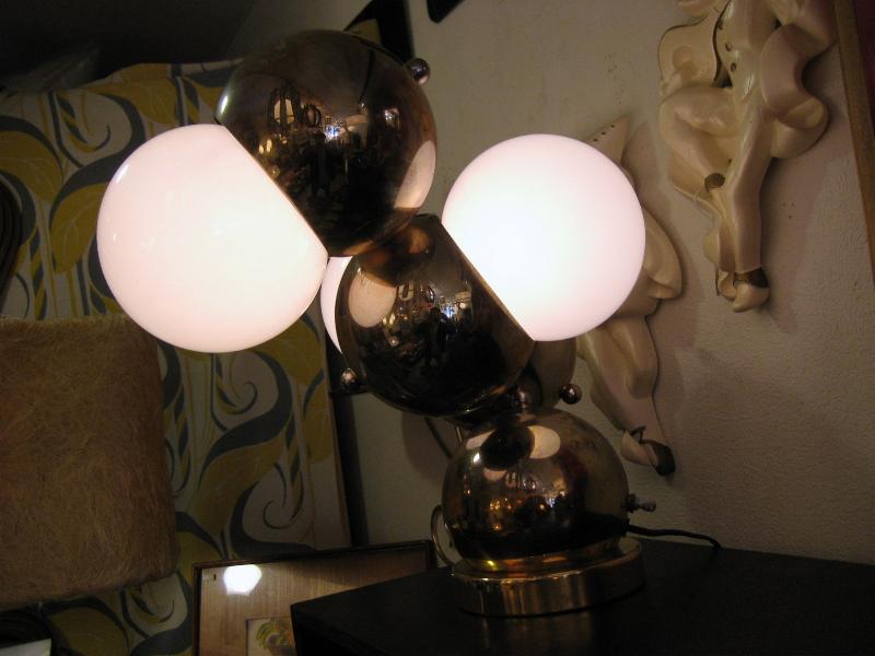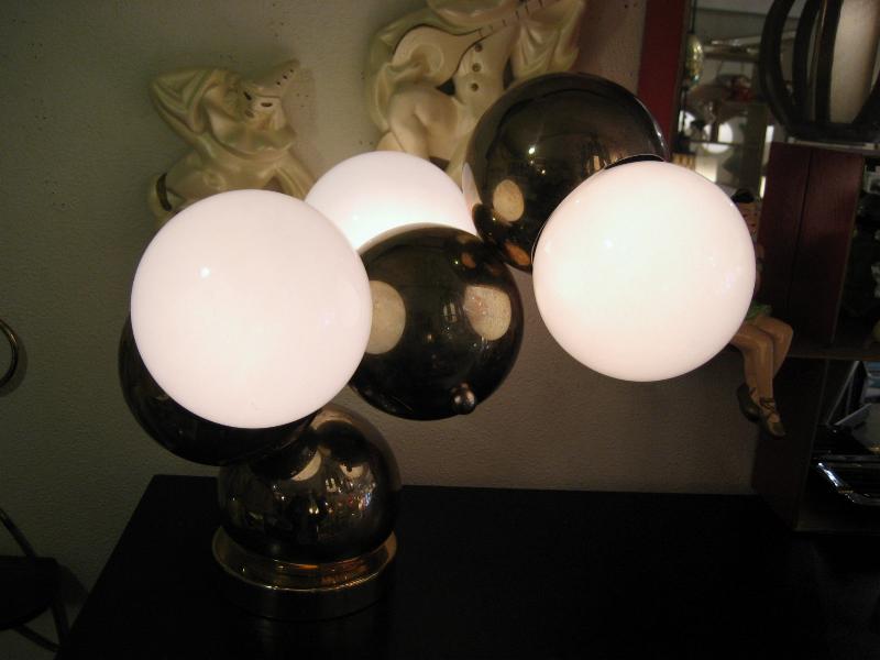 | アトミックテーブルランプ / 50年代 3連ドームシェイプシェードの真鍮製アクセントランプです。スプートニクとの相性もバッチリなクールランプ!ビッグサイズのボール球3個も付いています。電源は家庭用コンセント対応コードで、スイッチはベース側面(写真参照)に付いていてロータリータイプ。 ※電球は市販のボール球使用可能(口金サイズ:E26) |