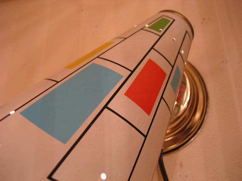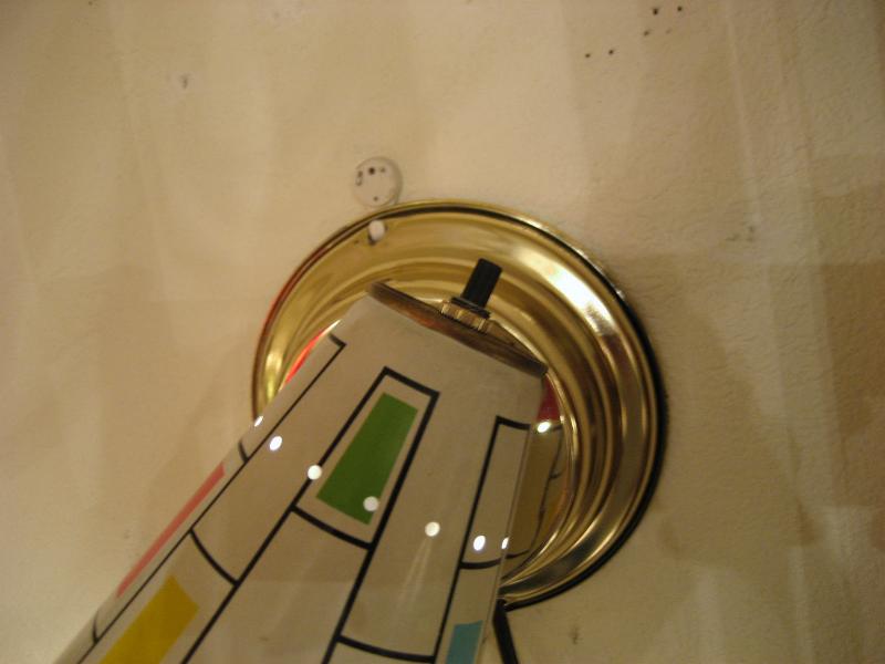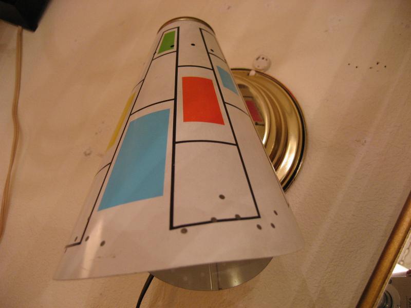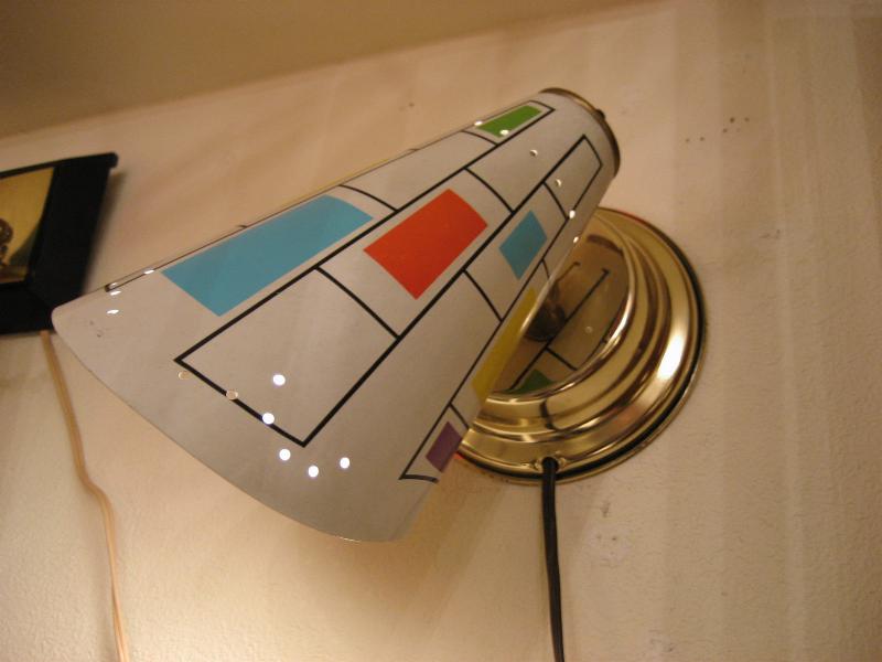 | ミッドセンチュリーモダンウォールランプ 50-60年代 メタルシェードの壁掛け用ランプです。ホワイトベースにサックスブルー・グリーン・オレンジ・イエロー・パープルなどのモダンスクエアが描かれたシェードは壁に掛かっているだけでモダンアートのような存在感!電源は家庭用コンセント対応です。スイッチはシェード後部付いていてロータリータイプです。 |