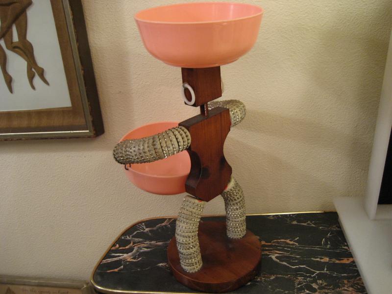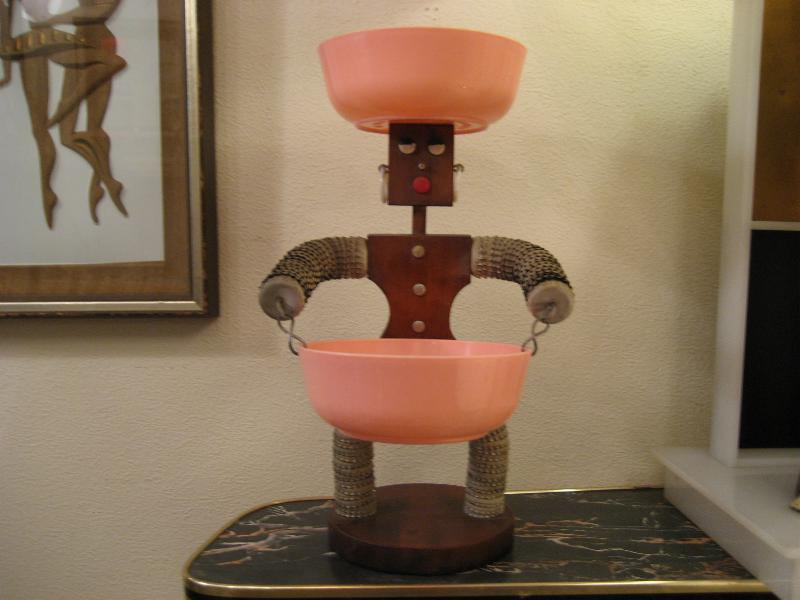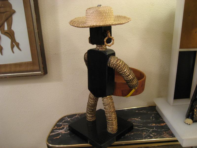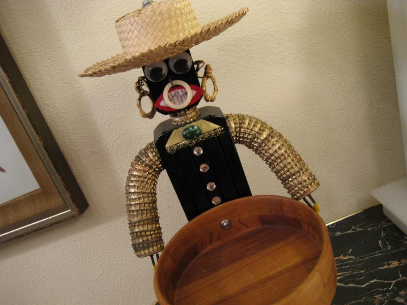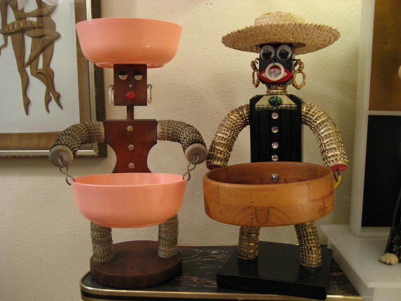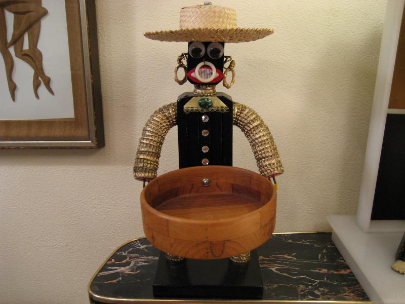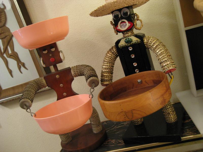 | ビンテージブラック置物/灰皿/小物入れ / 50-60年代 A. ブラウン 頭の上とフロントにピンクのプラスチックトレー付き黒人(アフリカン)タイプのシェルフデコ。ボディはウッドと王冠でできています。 B. ブラック 頭にストローハット、フロントにウッドトレーを持ったちょっと変わったタイプのアフリカンなシェルフデコ。ボディはウッドと王冠でできています。 どちらもディスプレイや鍵・小銭など小物入れにGOOD! |
