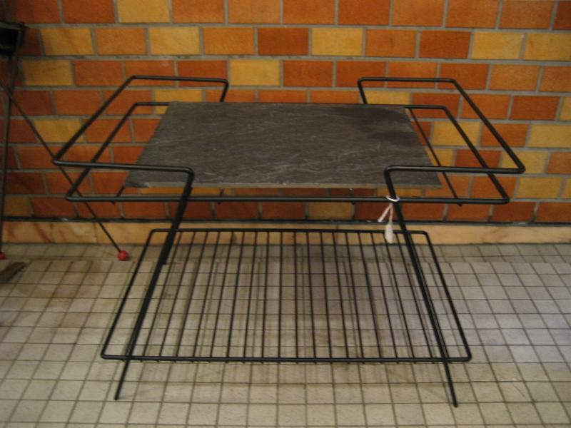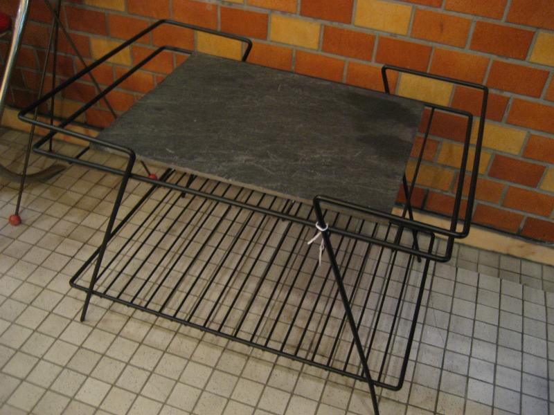 | アトミックアイアンシェルフテーブル / 50年代 ビンテージのアイアンラックです。本来はバーベキュー用のテーブルですが、下に1段シェルフが付いてますのでTVシェルフやベランダテーブル、フロアテーブルなどとして使用するのにちょうど良いサイズ。天板は石板で、トップはクールなダブルフレームです。 |