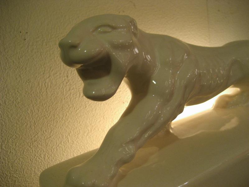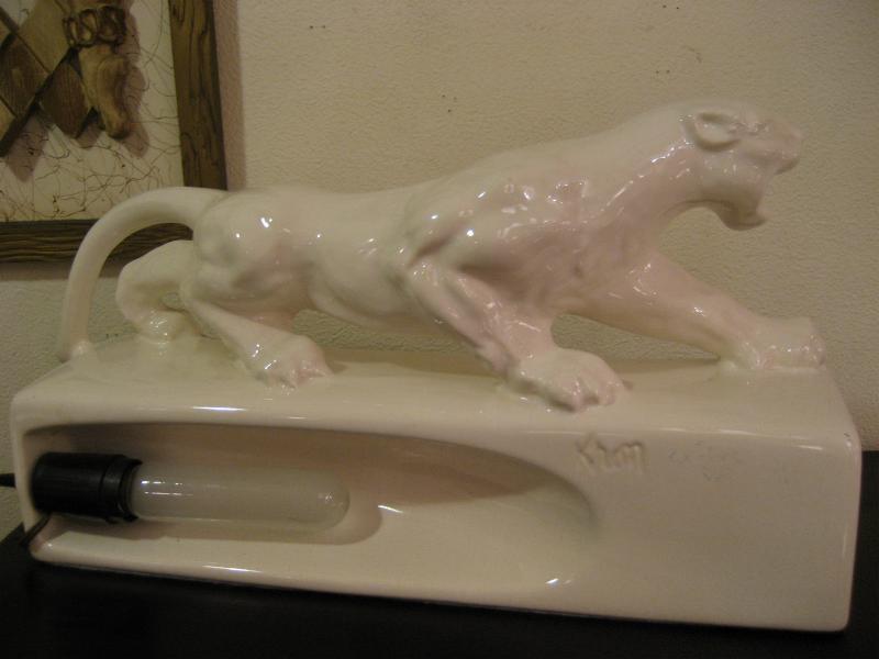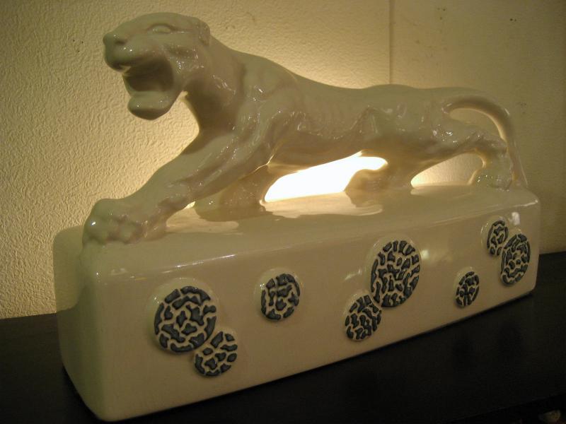 | ホワイトパンサー TVランプ 50年代 陶器製のパンサーTVランプ。 " T.V. Lamp " の本にも載っている50年代を代表するメーカーのひとつ。作りもリアルでGOOD! 電源は家庭用コンセント対応で、スイッチはベース側面に付いていてロータリー式です。 |
