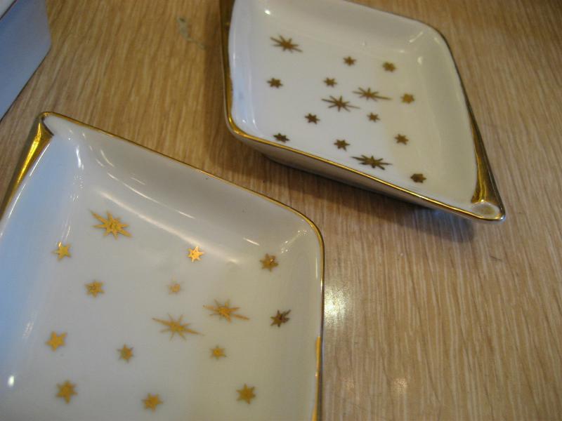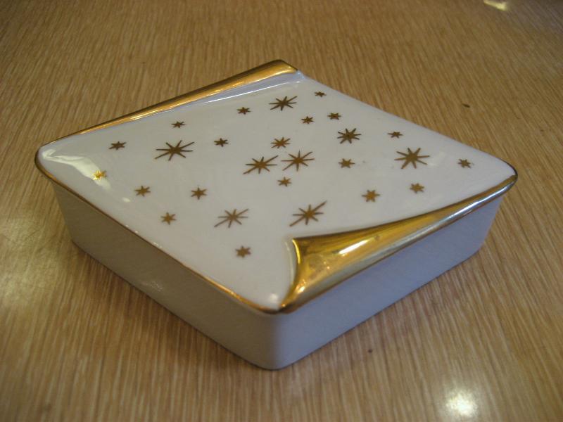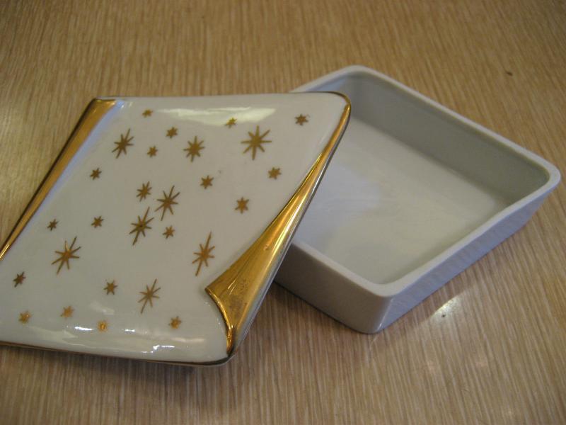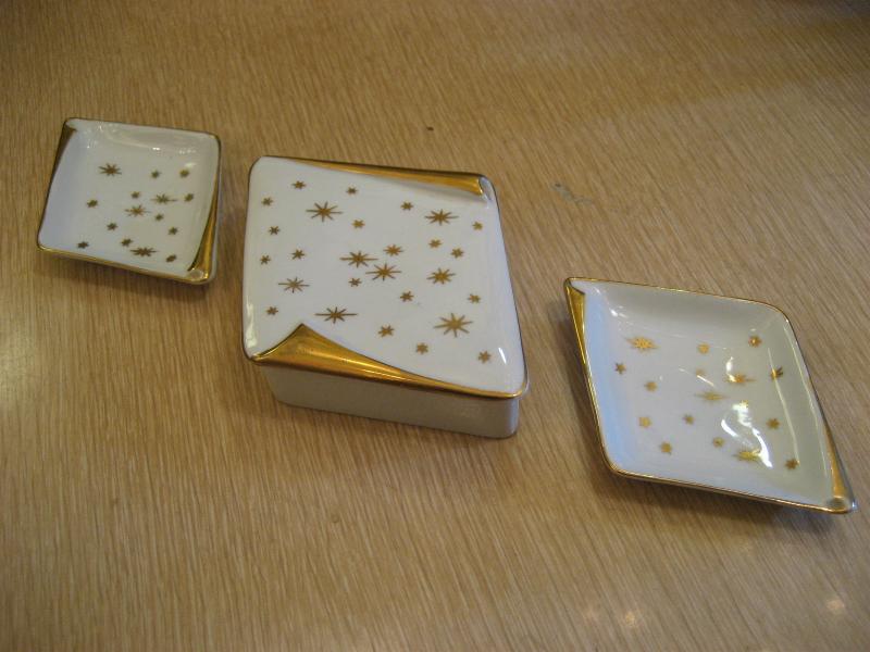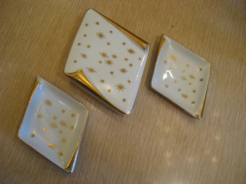 | スターバースト灰皿&シガレットボックス / 50年代 陶器製のゴールドスターバースト絵柄のボックス&アッシュトレイ。クールアトミックセット! |