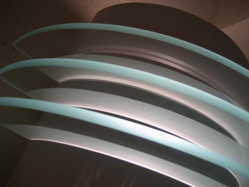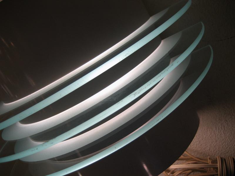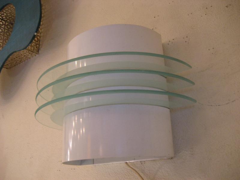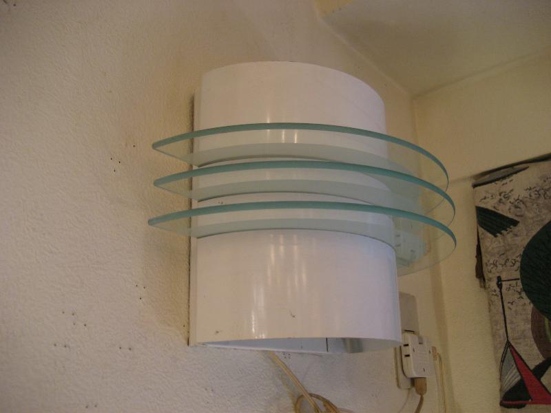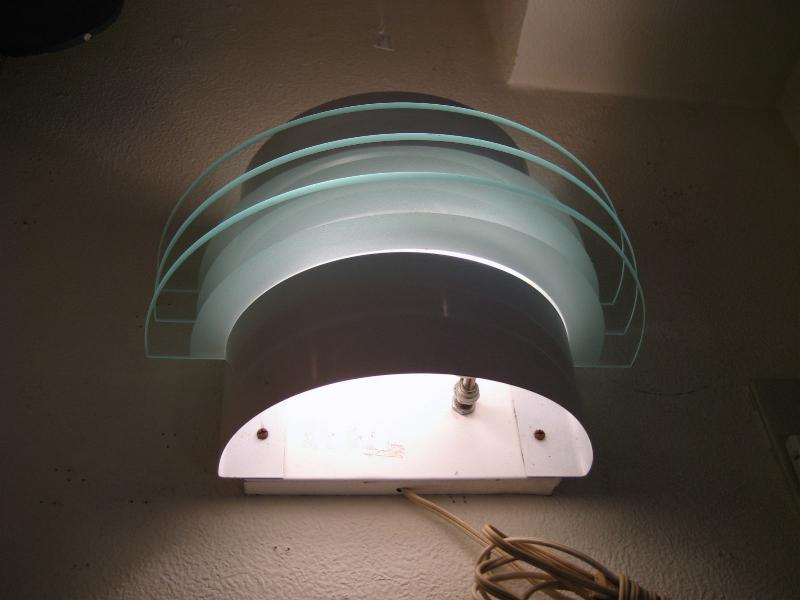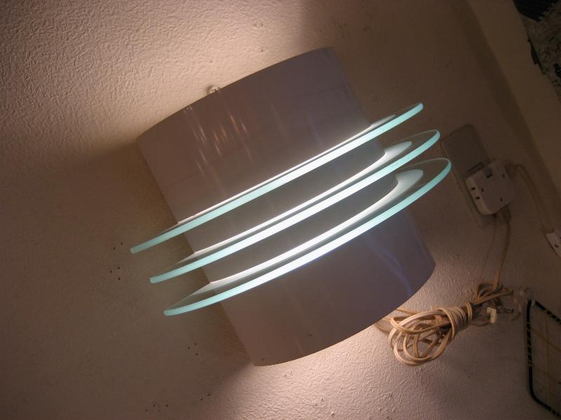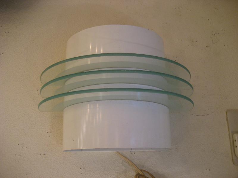 | アトミックウォールランプ / 60年代 半円柱のホワイトメタルボディにガラスの3段フィンデザインのスペーシーでクールな壁掛けランプ。電球は2個使用していて上下とガラスフィンから漏れる明かりがとってもムーディーなライティングピースです。 電源は家庭用コンセント対応です。スイッチはコード中間に付いていてロータリータイプ。 |