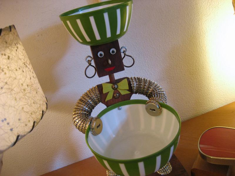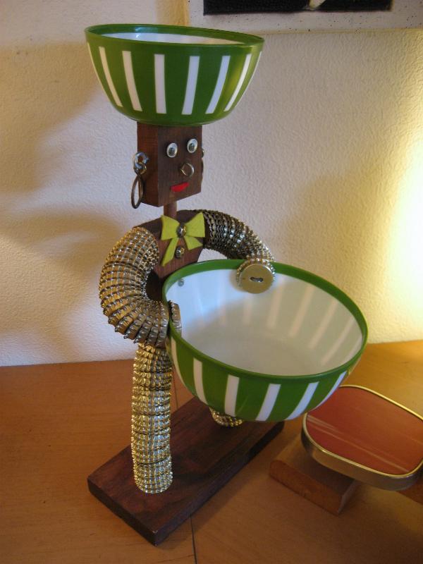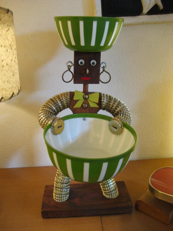 | ビンテージブラック置物/灰皿/小物入れ / 50-60年代 レアなグリーンとホワイトのストライプボウルタイプのシェルフデコ。ボディはウッドと王冠でできています。ディスプレイや鍵・小銭など小物入れにGOOD! |