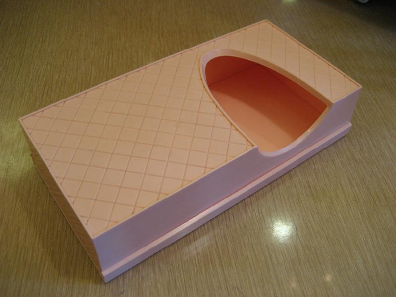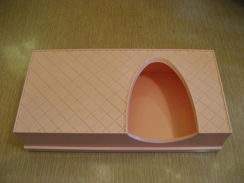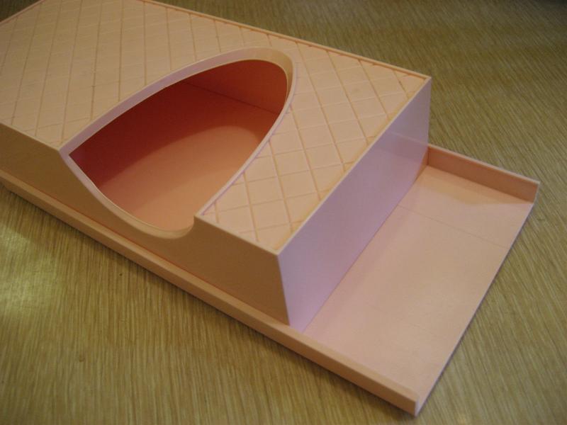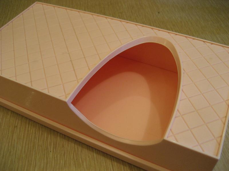 | ビンテージティッシュケース (ホルダー / ボックス) / 50年代 ベビーピンクのボディカラーでハーレクインダイヤ柄のビンテージティッシュケース。取り出し口がブーメランシェイプでセンターではなく、少しヨコにずらしているデザインがポイントのクールなバニティピース! 底面はスライドタイプです。 |