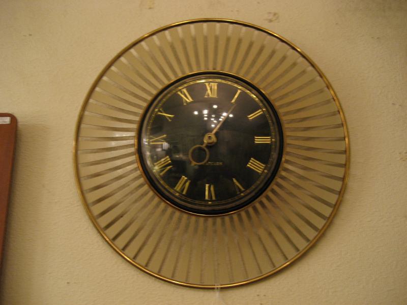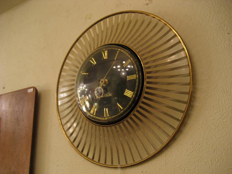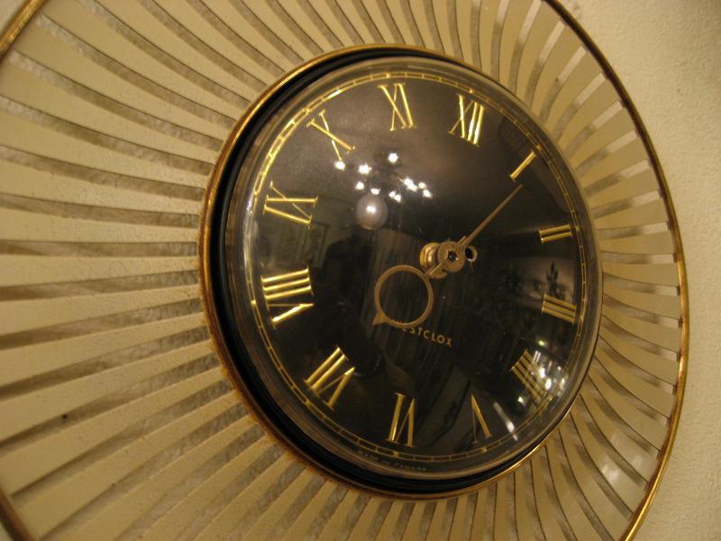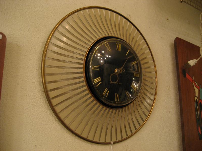 | アトミックスターバーストウォールクロック / 50年代 USA スターバースト壁掛け時計。ブラック文字盤にゴールドダイヤルとゴールド針。スターバーストフレームはアイボリーカラーのフィンタイプ。 ムーブメントはバッテリータイプ(単3x1個使用)に交換済みですので時間も正確です。 |