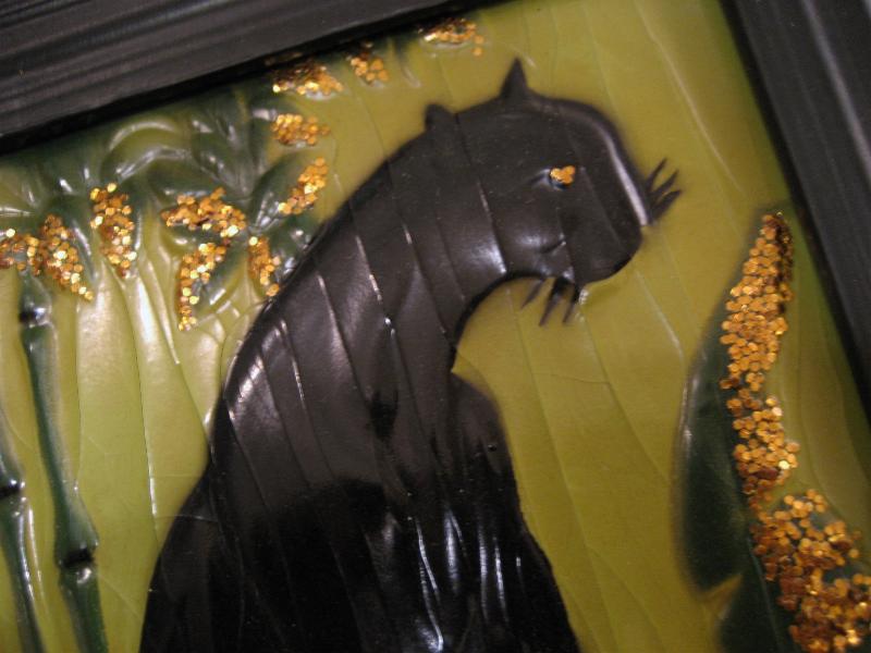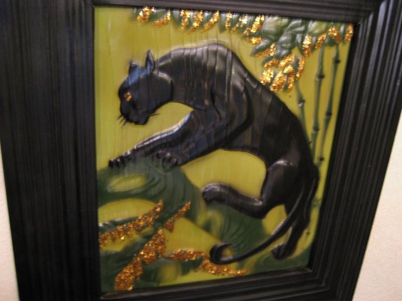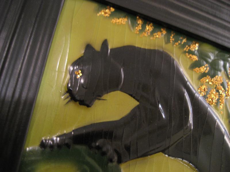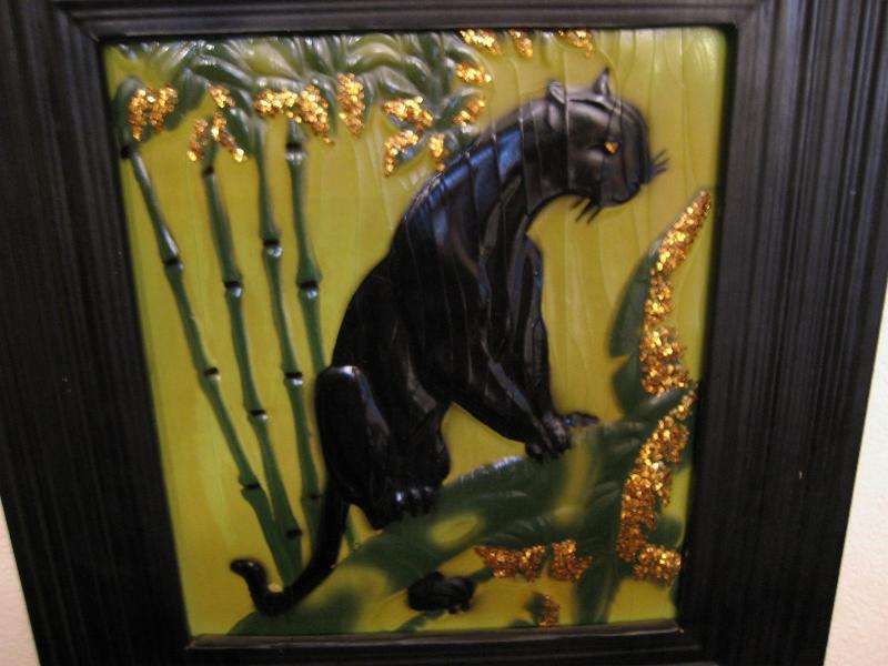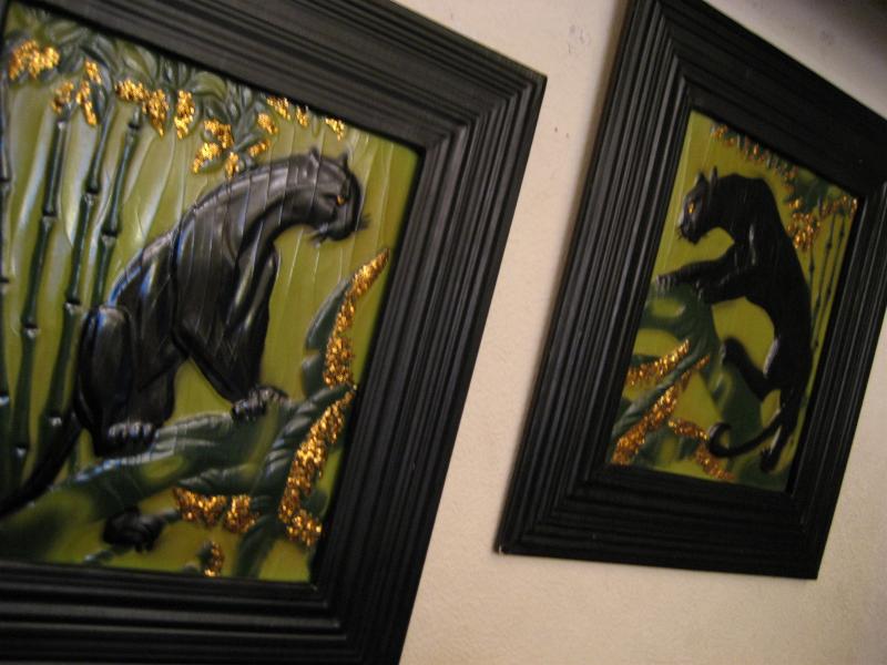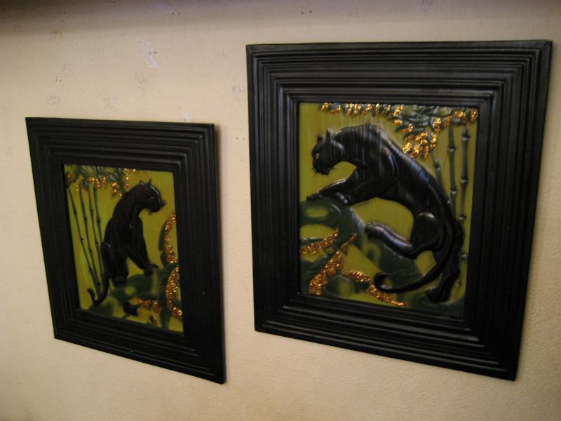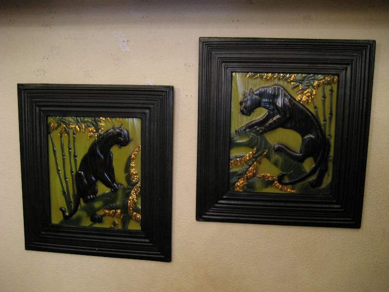 | ペアブラックパンサーウォールデコ / 1950年 50年代カリフォルニアアートの代表でもある黒豹のビンテージ壁掛けです。ピクチャー部分はエンボス加工でゴールド部分はジュエリーを貼り付けてあるようです(裏面説明参照)。フレームはプラスチック製。バックにメーカープリント有。50年代ど真ん中のクールペア! |