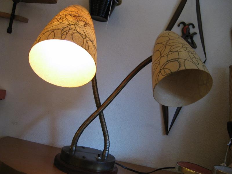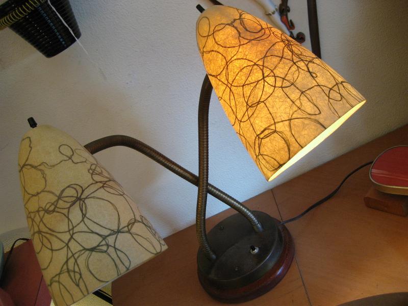 | アトミックダブルシェードランプ / 50年代 USA フレキシブルツインアームのデスクランプタイプ。シェードはファイバーグラス製。各アームの方向はかなり自在に調節可能ですからいろいろなスタイルで楽しめます! 電源は家庭用コンセント対応コードで、スイッチはランプベースと各シェード後部にそれぞれ付いています。 |