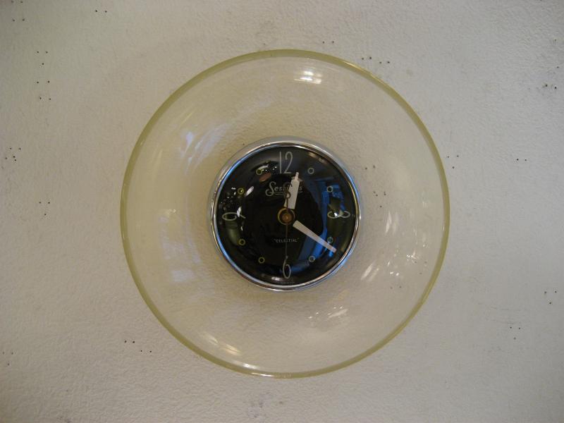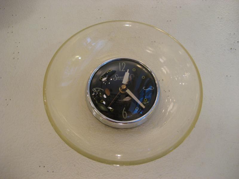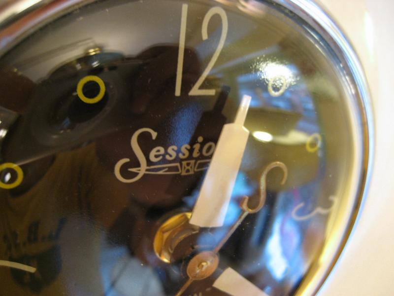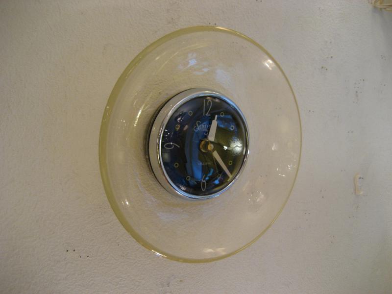 | アトミックウォールクロック / 50−60年代 セッションクロック社製 分厚いルーサイトフレームがスペーシーな壁掛け時計。ブラック文字盤にホワイトダイヤルとホワイト針、秒針はゴールドで社名の"S"字がデコレーションされています。 ムーブメントはバッテリータイプ(単3x1個使用)に交換済みですので時間も正確です。 |
