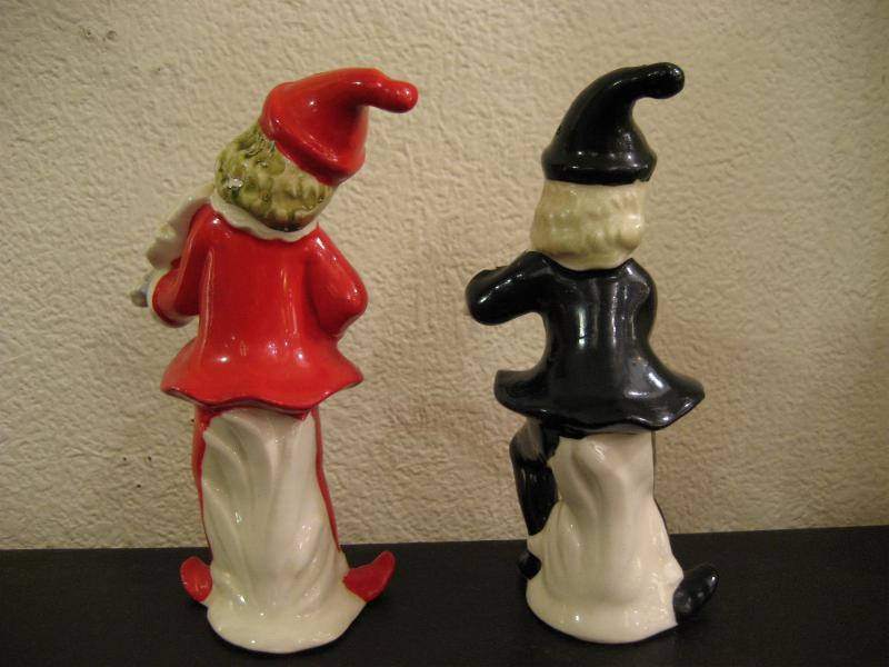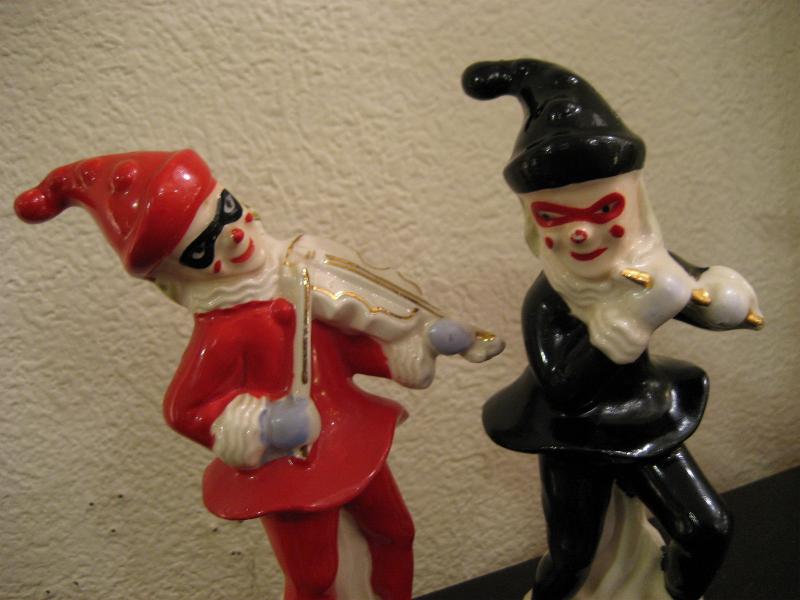 | ペアハーレクイン置物(S&P) 50年代 陶器製。赤黒ペアミュージシャンタイプのハーレクインです。それぞれフルートとバイオリンを演奏しています。キュートでクールなソルト&ペッパーです。 |