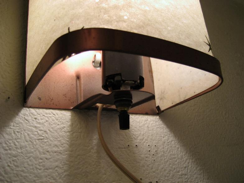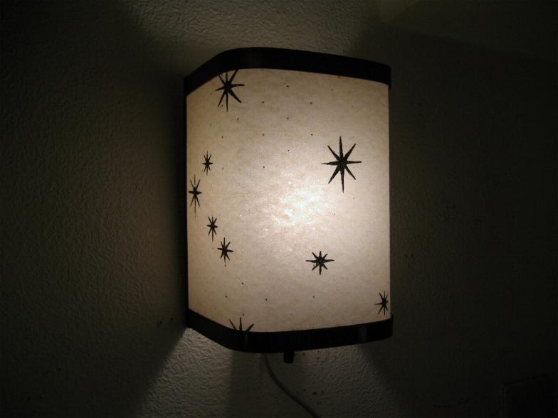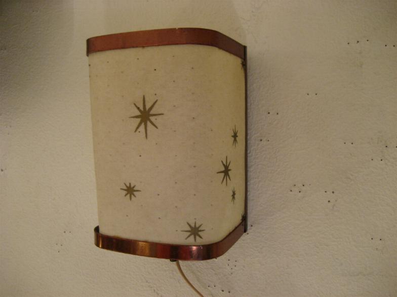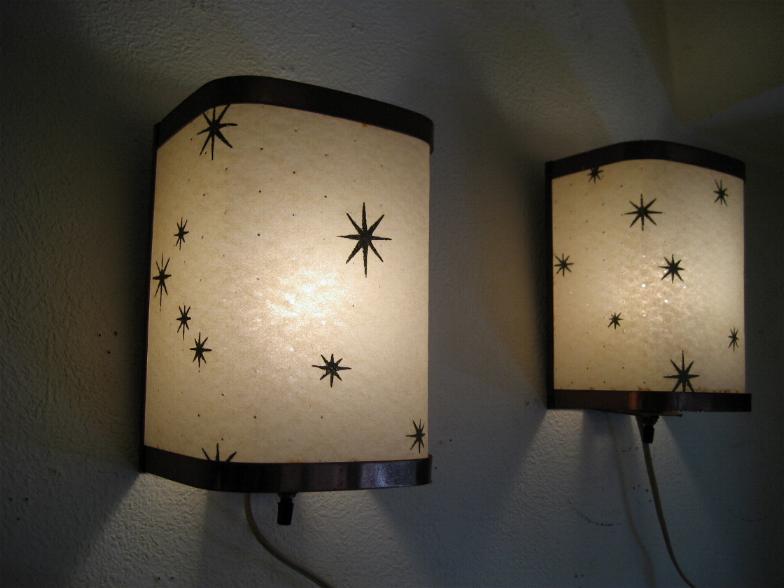 | スターバーストウォールランプ 50年代 ファイバーグラスシェードにアトミックスターバーストプリントの壁掛け用ランプです。電源は家庭用コンセント対応です。スイッチはランプソケット下に付いていてロータリータイプです。 在庫1個になりました。左側の商品になります。 |