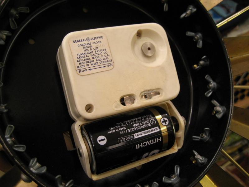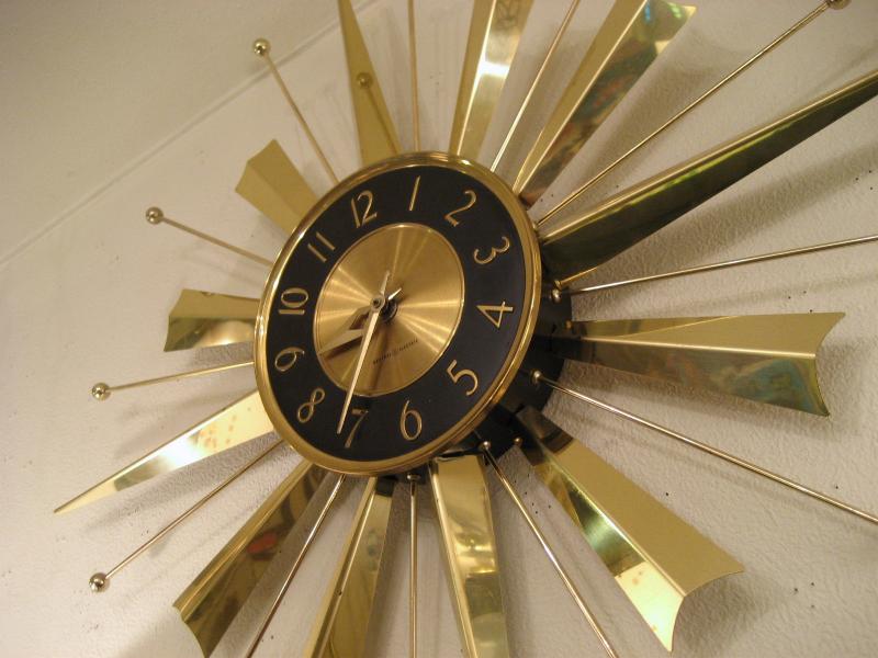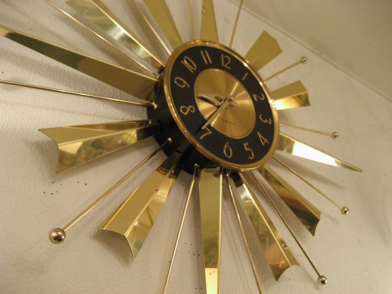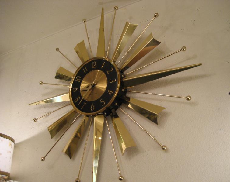 USA 50-60年代 ゴールドブラスのスプートニクスポークとフィンのデコレーションがアトミックでクールなスターバースト壁掛け時計。文字盤は黒金で針はゴールドハンド。 ムーブメントはGEオリジナルバッテリータイプ(単1x1個使用)で当時主流だった西ドイツ製。 |