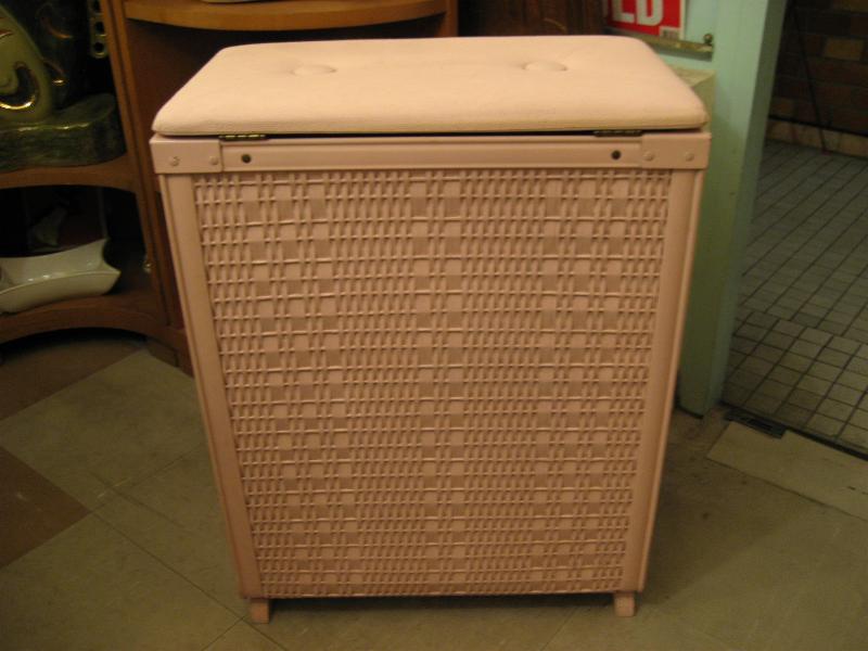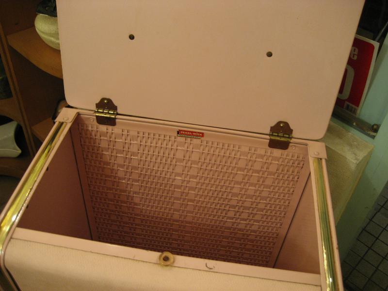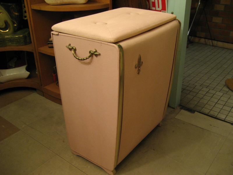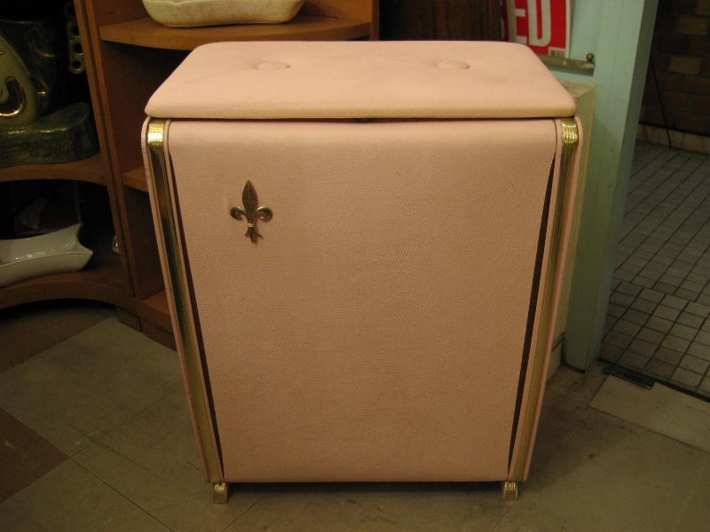 | アトミックハンパー / 50年代 ピンク/ゴールドのクールでキュートなハンパー(洗濯物入れ)です。フロントにアトミックなゴールドアクセント、両エッジにゴールドモールデコ、アクセントと同デザインのハンドル付き。実際に洗濯物入れとして使っても良し、トップのフタに薄いクッションが入っているのでテレフォンチェアやフロアディスプレイにもいいですよ。洗濯するのが楽しくなるGOODピースです! |