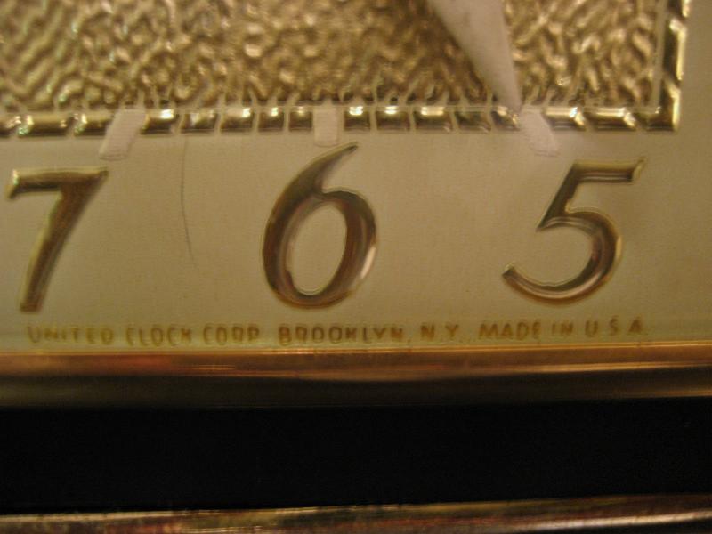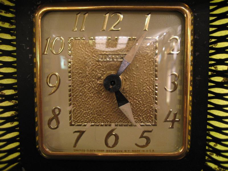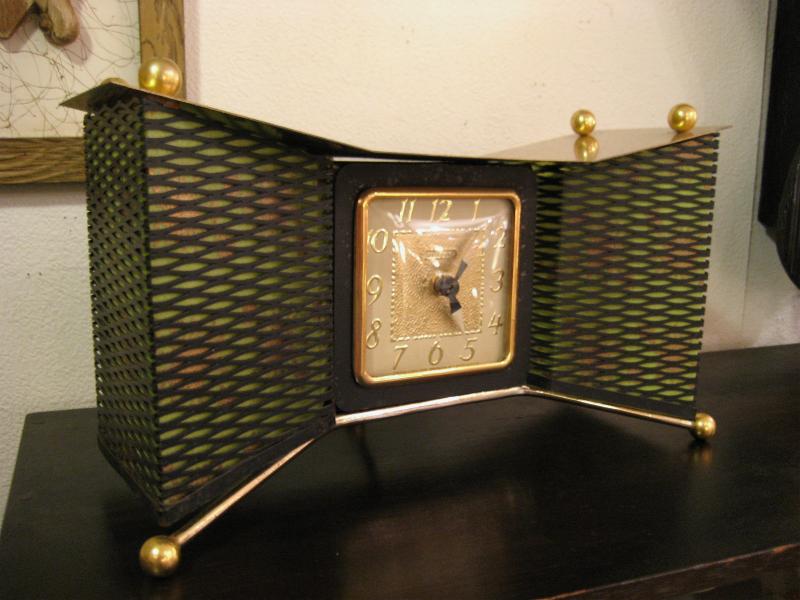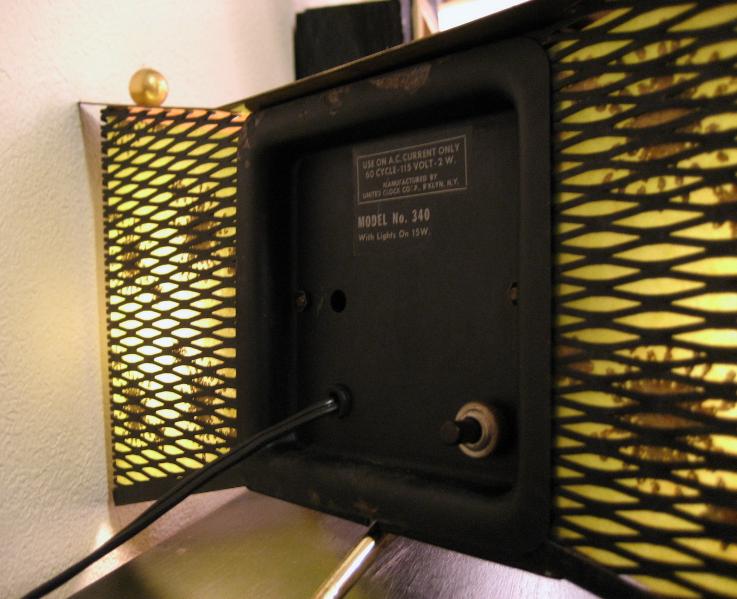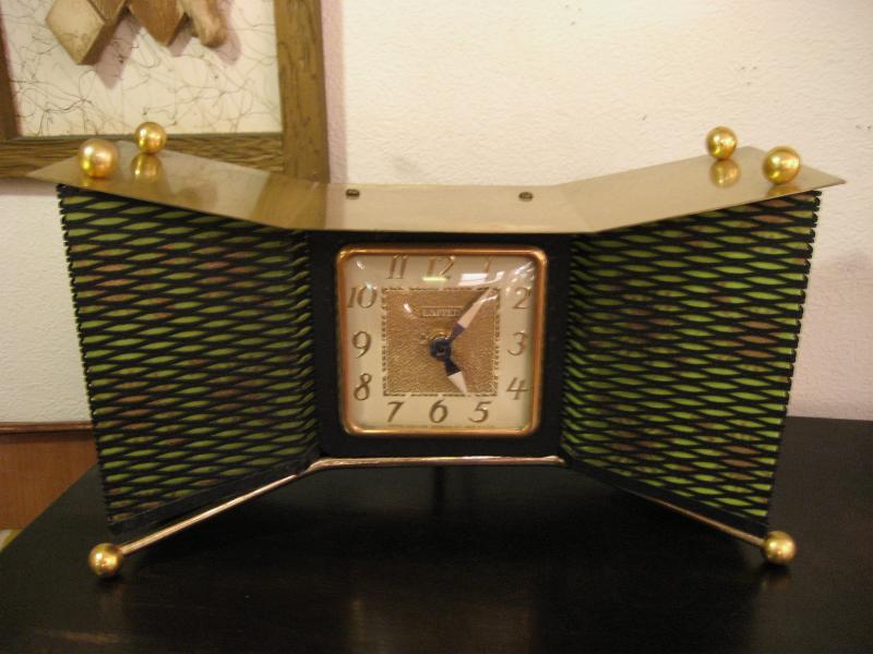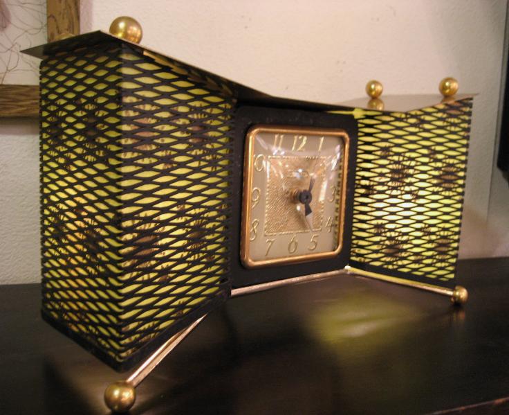 | アトミックライトアップシェルフクロック(置時計) / 50年代 ユナイテッドクロック社 ランプ付き置時計です。両サイドのメッシュ部分にシェードがはめ込んであり、グリーンのファイバーグラスシェードでゴールドスターバーストプリント。3本のスプートニクレッグがクール! ランプ用の電源は家庭用コンセント対応コードで、スイッチは本体裏面に付いています。時計のムーブメントはバッテリー式(単3x1コ使用)に交換済ですので時間は正確です。 |