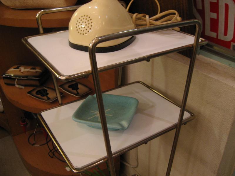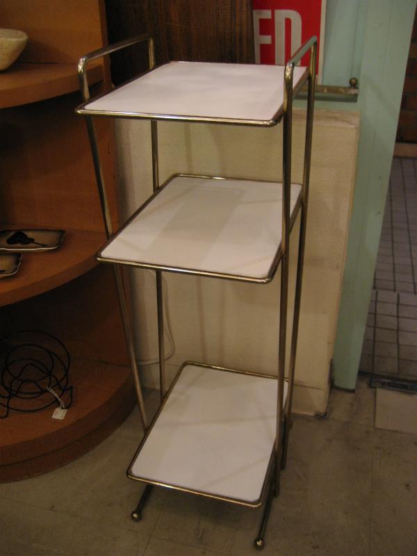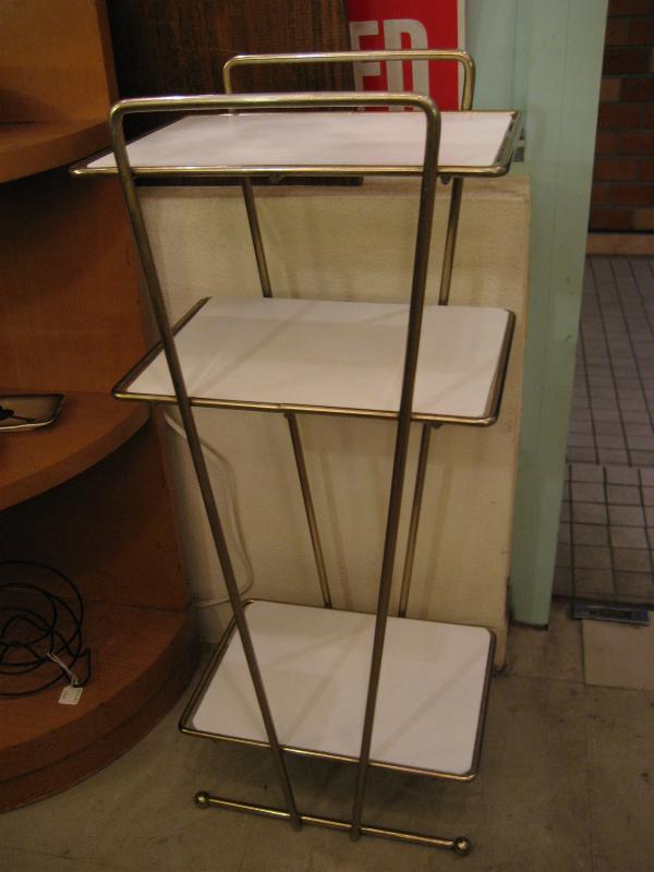 | ビンテージアトミックフロアシェルフ / 50-60年代 USA. ゴールドブラスフレームに3段のアトミックシェルフです。各ウッドシェルフはホワイト。1-2段目と2-3段目の高さが違うのでディスプレイの幅も広いのでは・・・?フレームデザインのクールなフロアピースです! |