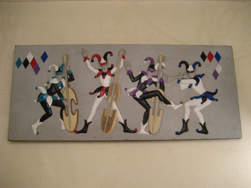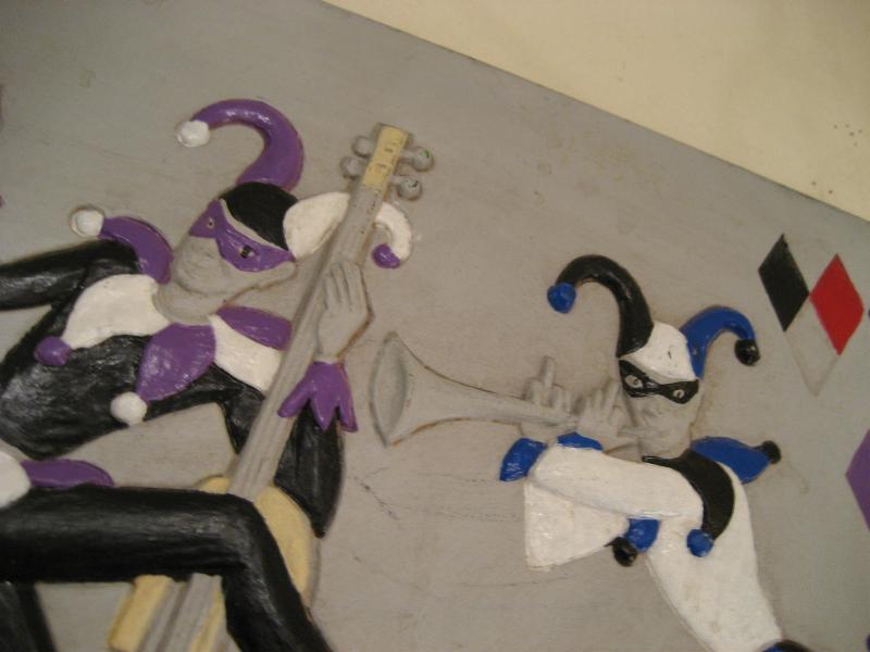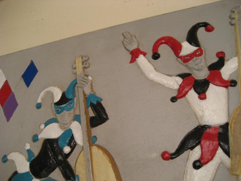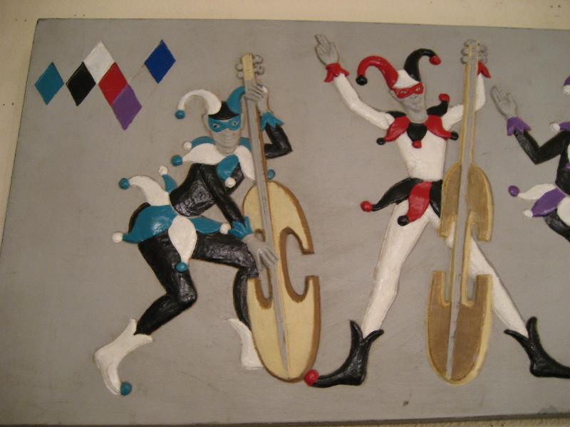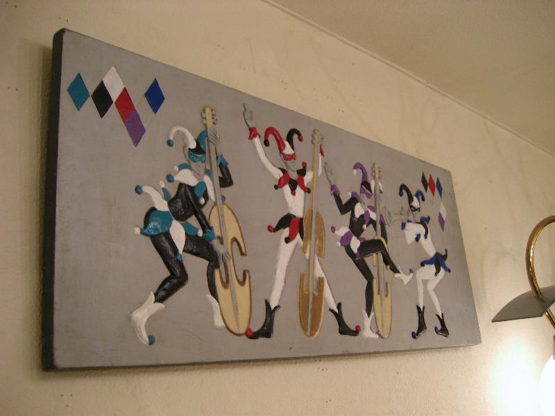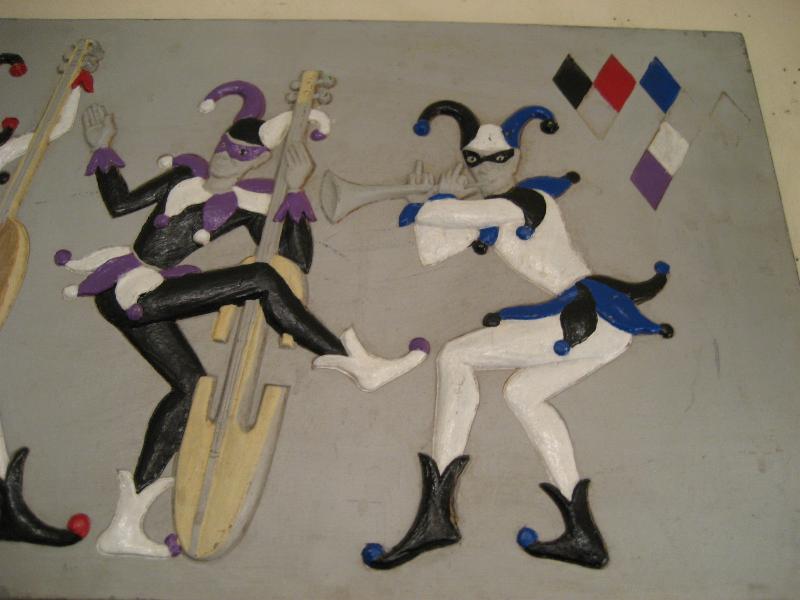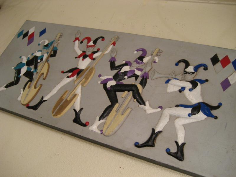 | ハーレクインミュージシャンバンド壁掛け 50-60年代 バーウッド社製の4人ハーレクインバンドウォールデコ。浮き彫りのように彫り込んでハンドペイントで仕上げています。それぞれ4色カラーの衣装で両サイドの上の方にダイヤ柄がアクセントされています。 |