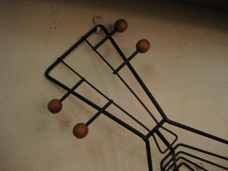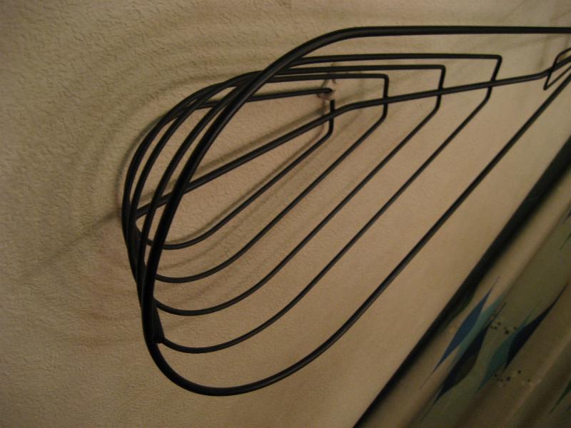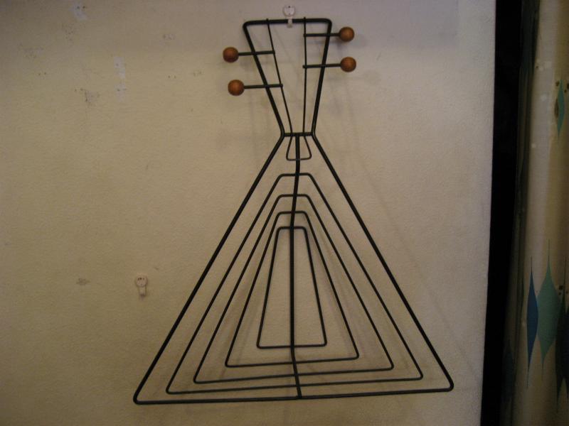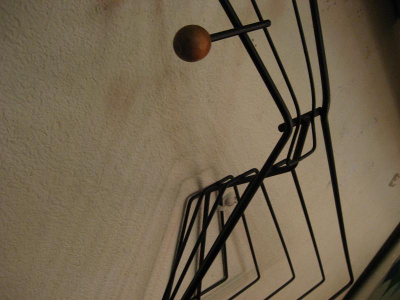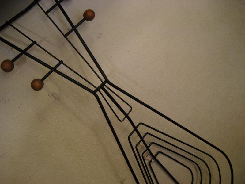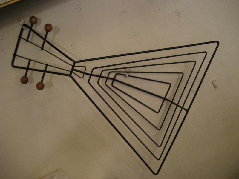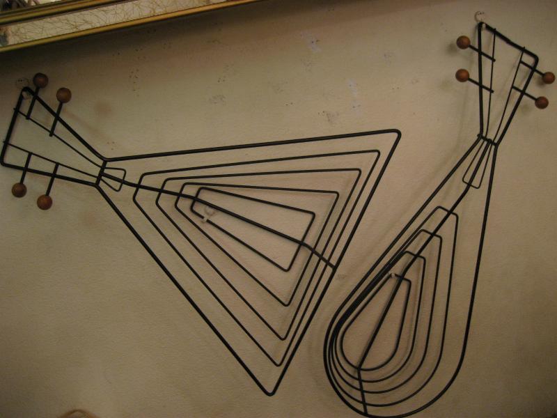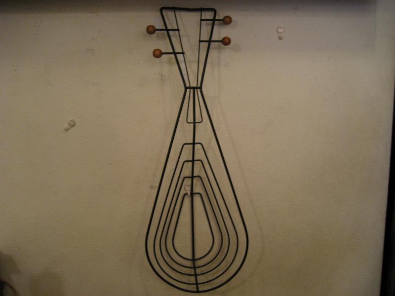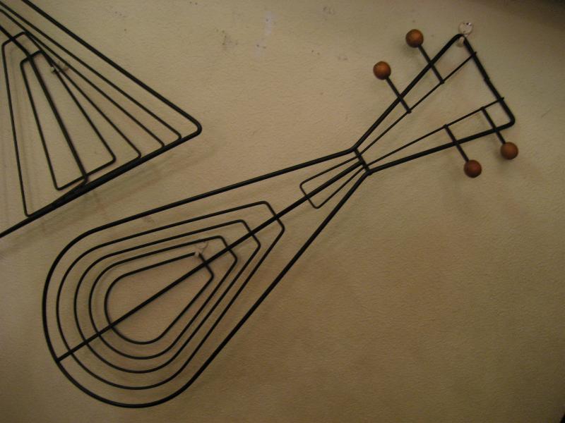 | ビンテージアイアンウォールデコ / 50年代 USA. ウェインバーグ 弦楽器デザインシェイプのビンテージ壁掛け(ウォールディスプレイ)。ブラックワイヤーにウッドボールアクセント。立体的に作られているため壁に飾ると照明の角度によって雰囲気のある陰影が出ます。クールでモダンなウォールピースです! |
