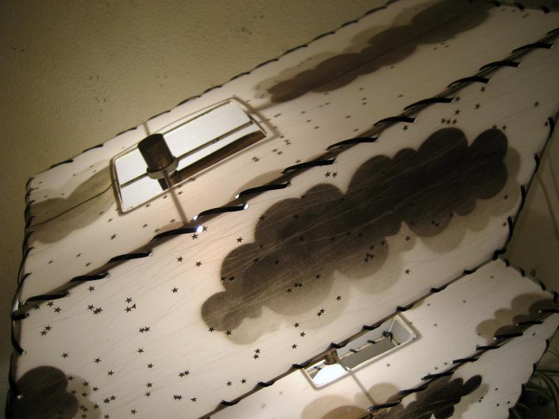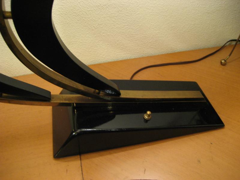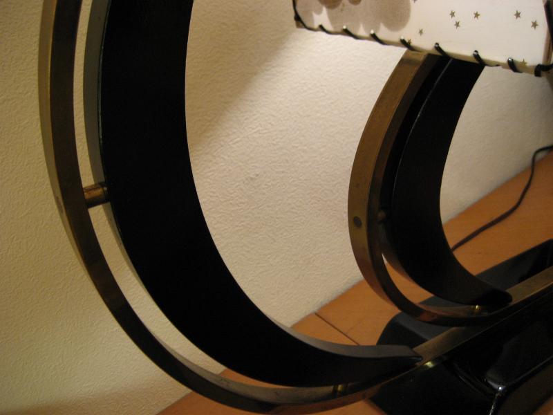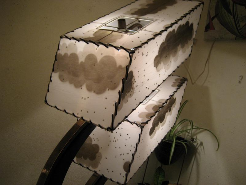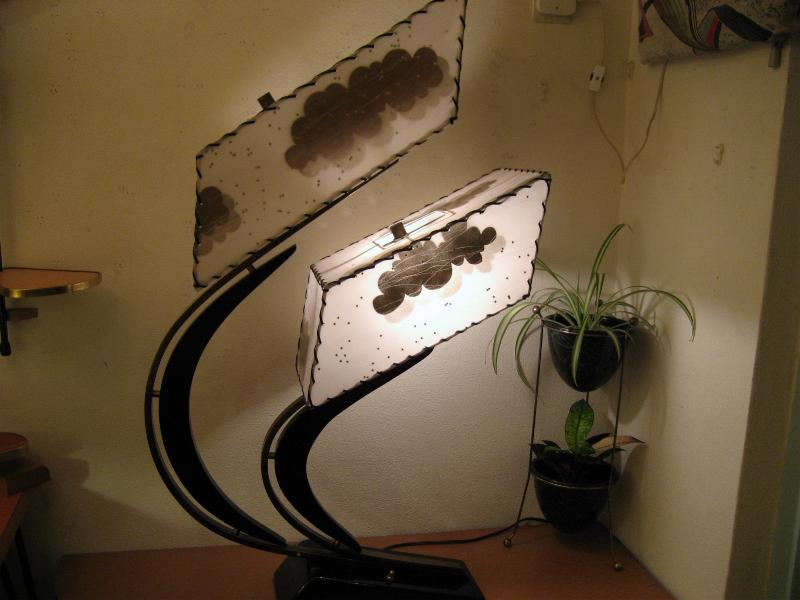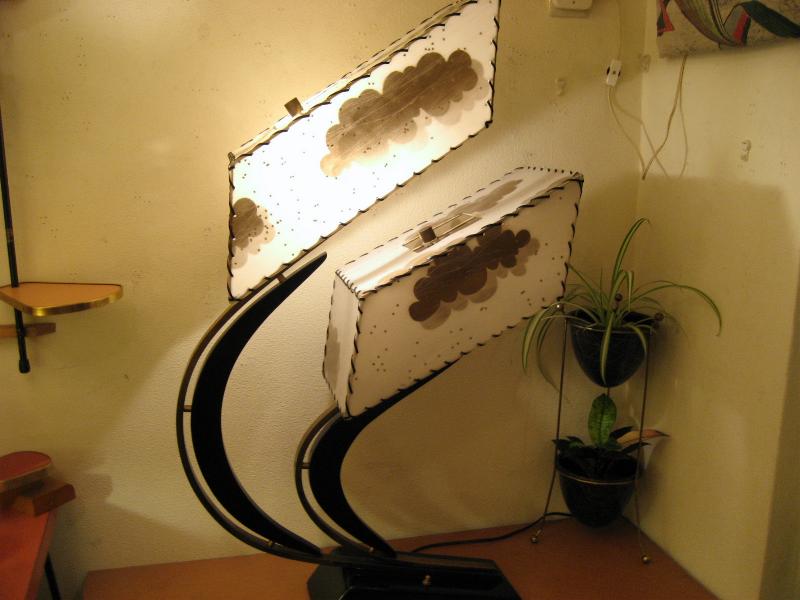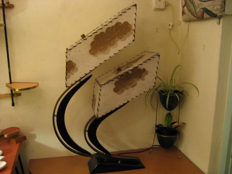 | アトミックビンテージ シェードランプ / 50年代 USA. ダブルスクエアシェードのマジェスティックランプ。シェードはレアな雲柄でアクリル製パネル。ブラックウッドベースにアームはゴールドブラスとブラックウッドのブーメランデコレーション。スーパークールなライティングピース! 電源は家庭用コンセント対応コード、スイッチはベースに付いていてロータリー式3Wayタイプ。 |