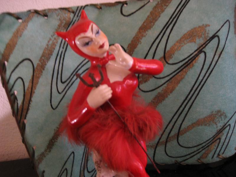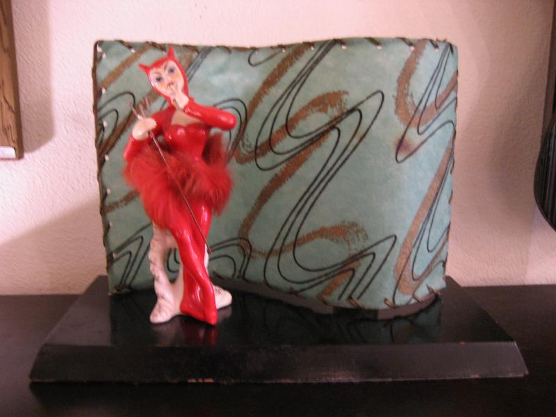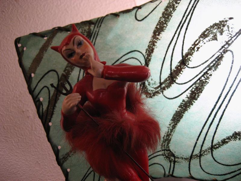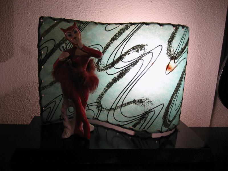 | ビンテージデビルTVランプ / 50年代. 陶器製デビルレディのTVランプです。シェードはファイバーグラス製でクールなアトミックプリント。ベースはウッドでブラックペイント。電源は家庭用コンセント対応コードで、スイッチはランプソケット部分に付いていてスライドタイプ。 |