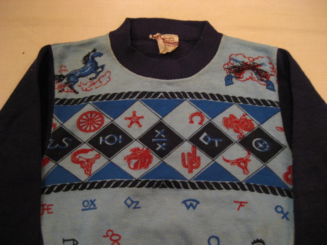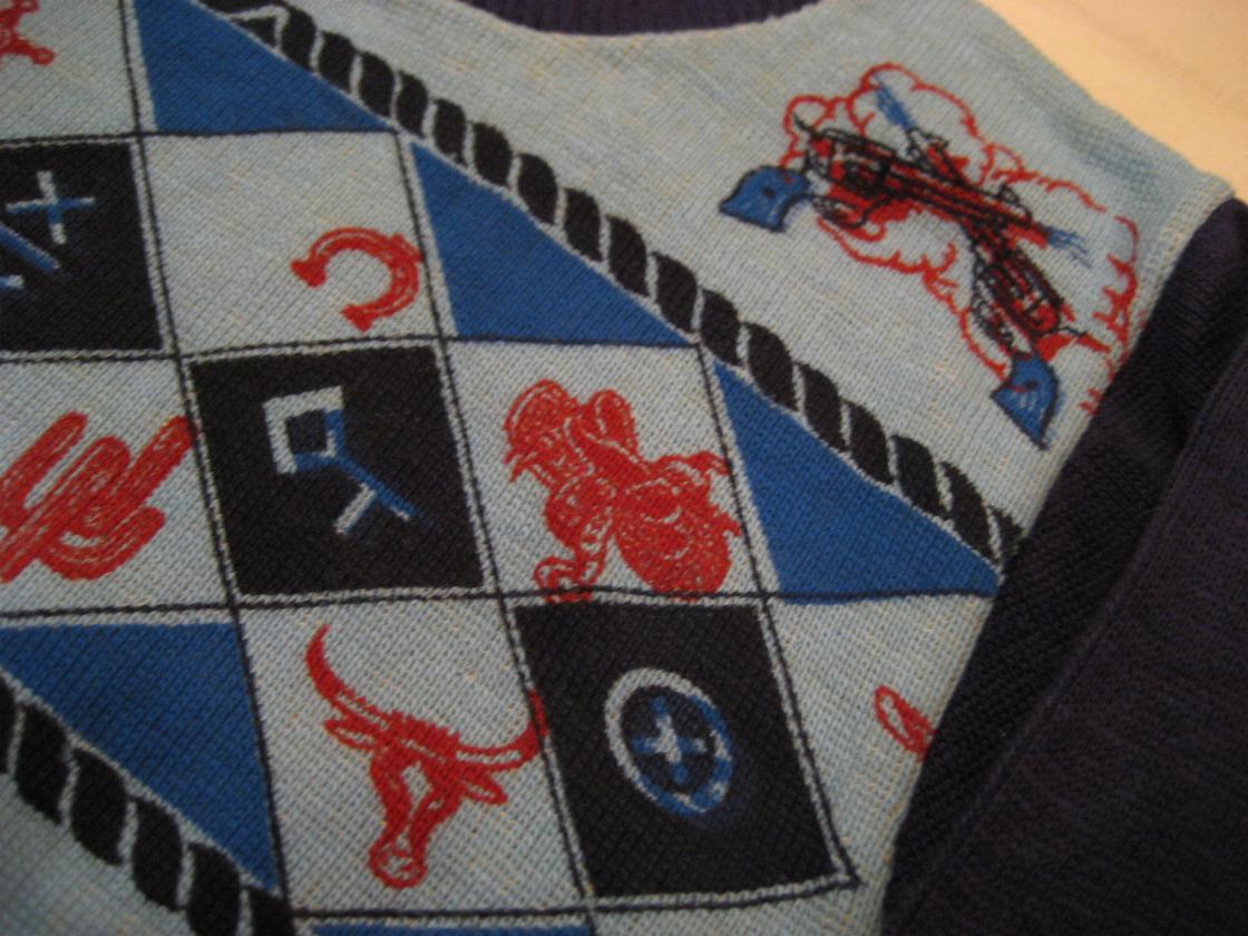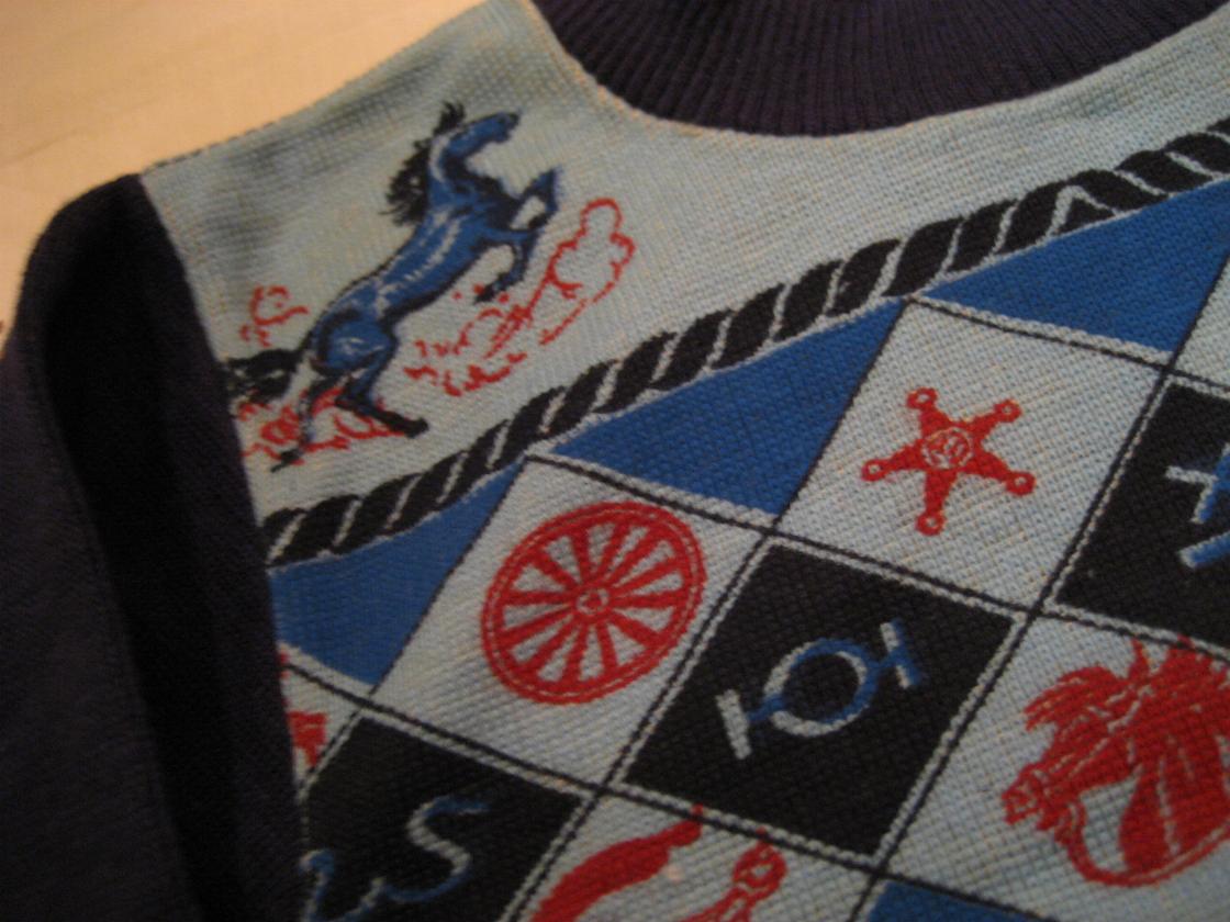 | ビンテージセーター / 40-50年代 / MADE IN USA. デッドストック ウェスタン柄のセーターです。フロントだけのパネル柄でいかにも!って感じです。素材はウール混ですがおそらくコットン混率が高めだと思いますのでネックなどのチクチク感は無いでしょう。どちらかというとスウェット感覚で着れるのでは?! 大人服顔負けのリブ長でカッコイイですよ! ディスプレイにもGOOD! 親子でキメるのにGOOD! For ロカビリーキッズ!!! |